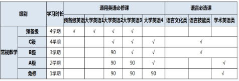 每个等级的员工按照以下图表中“√”规定的范围选课、修满对应学分。被分入免修级、A级、B级的员工,默认获得低于其级别的学分,并按90分计入其成绩单(详见图表)。