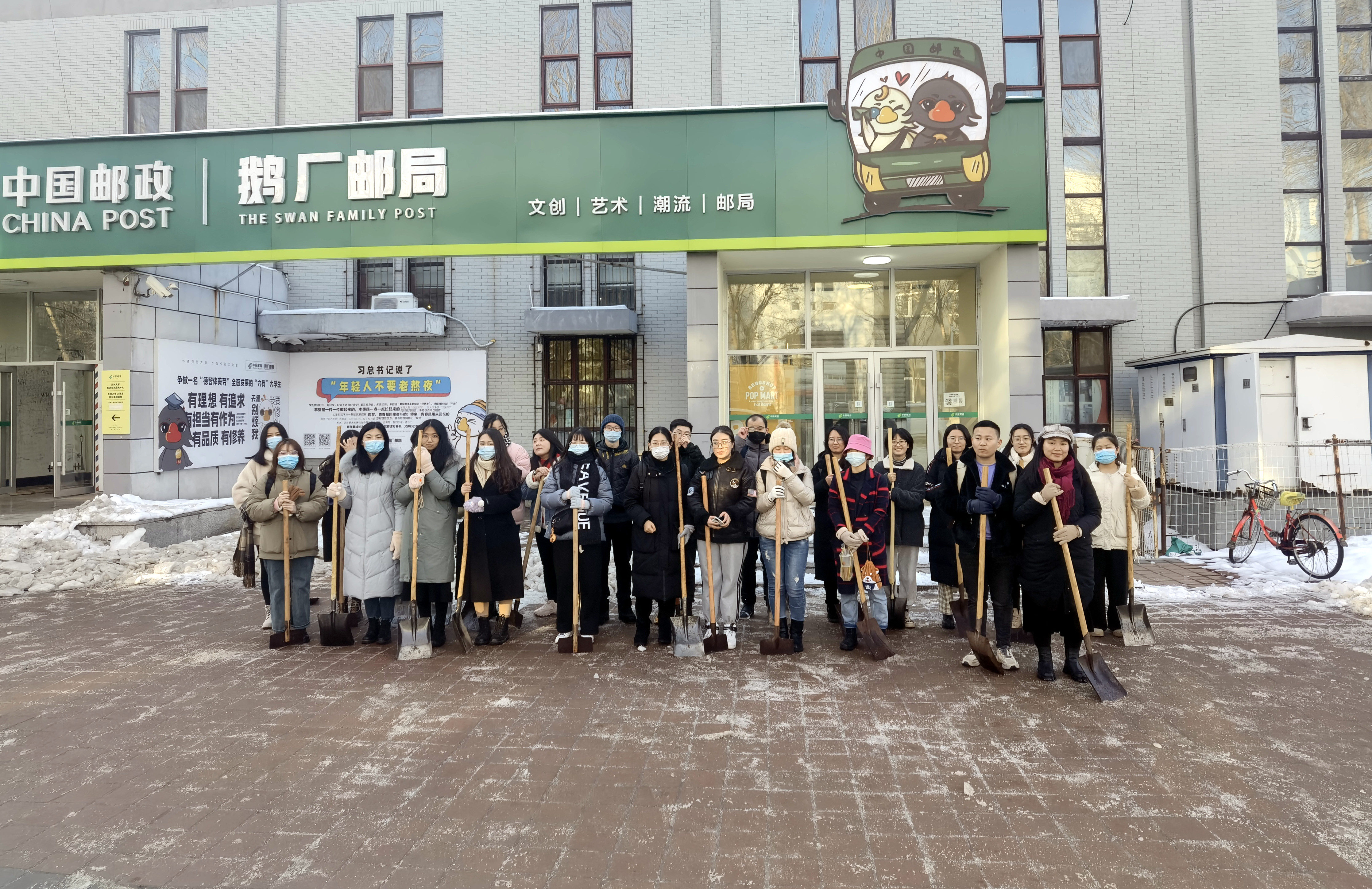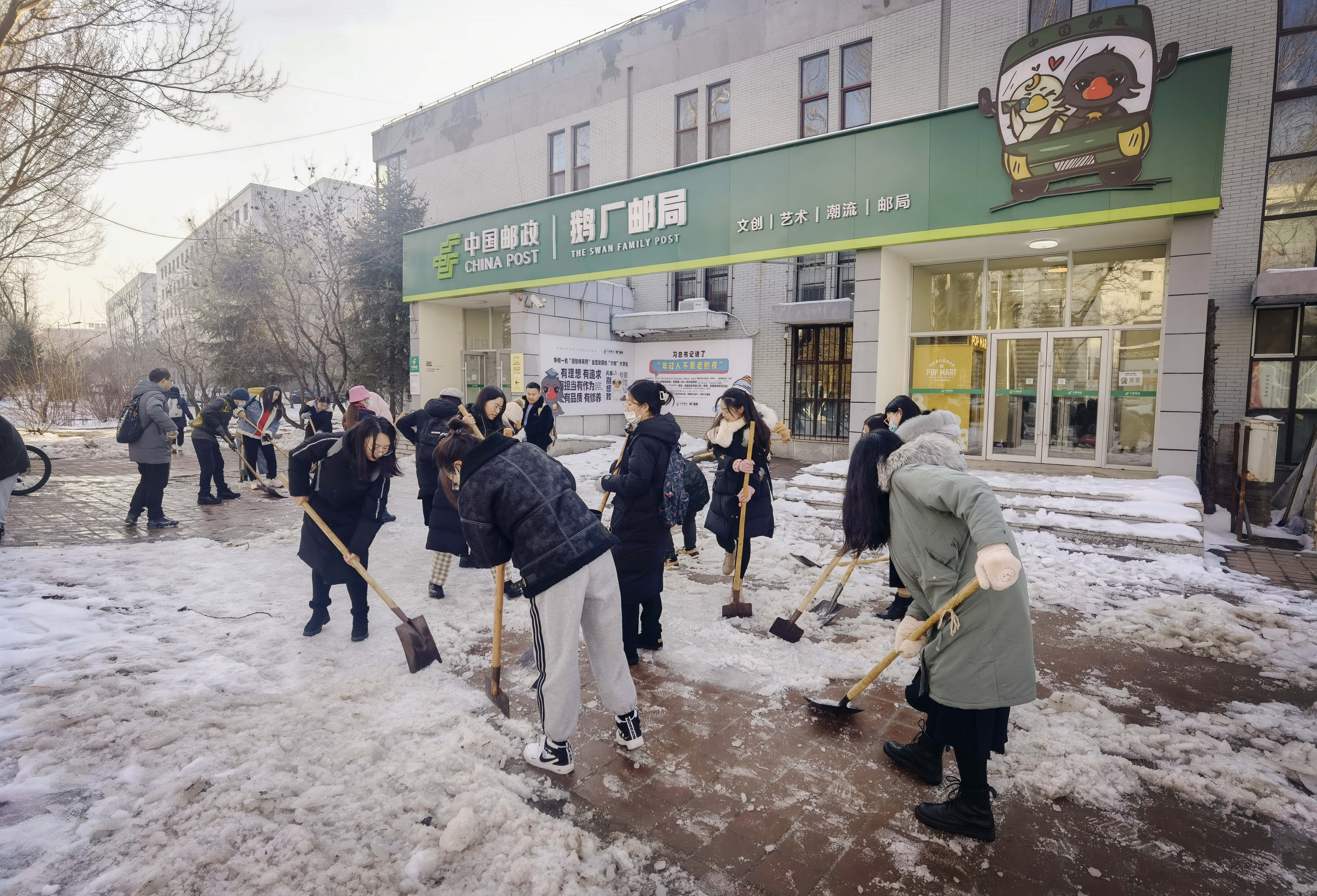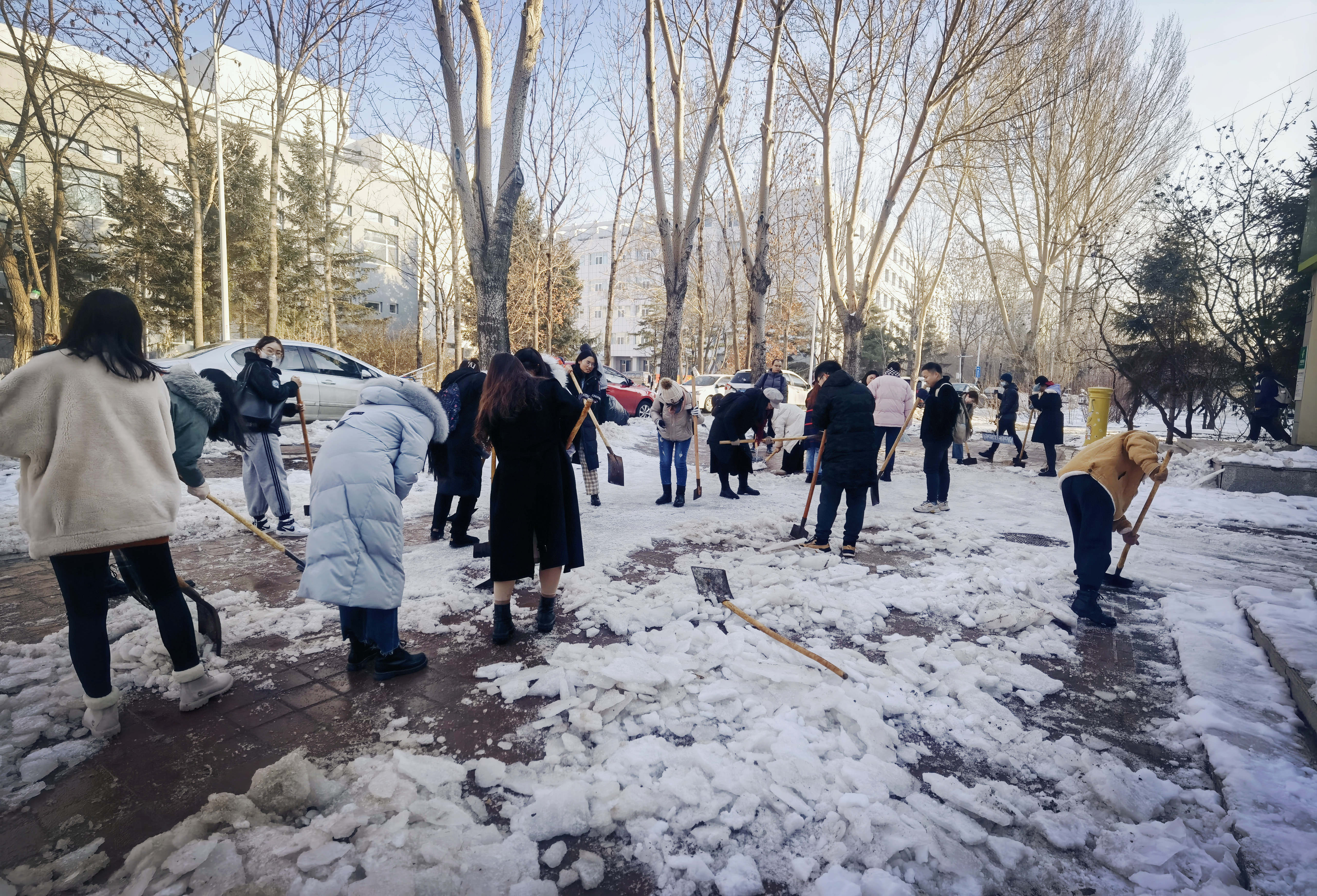 在校的党员和入党积极分子们活力满满、成群结队,拿着铁锹铲子等除雪工具,前往湖畔餐厅和学校邮局。冻僵的双手、刺骨的寒风无法冷却同学们的劳动热情,一个半小时后湖畔餐厅和邮局前侧以及北侧辅路被清理干净。师生就餐和办理邮寄的道路得到安全保障。