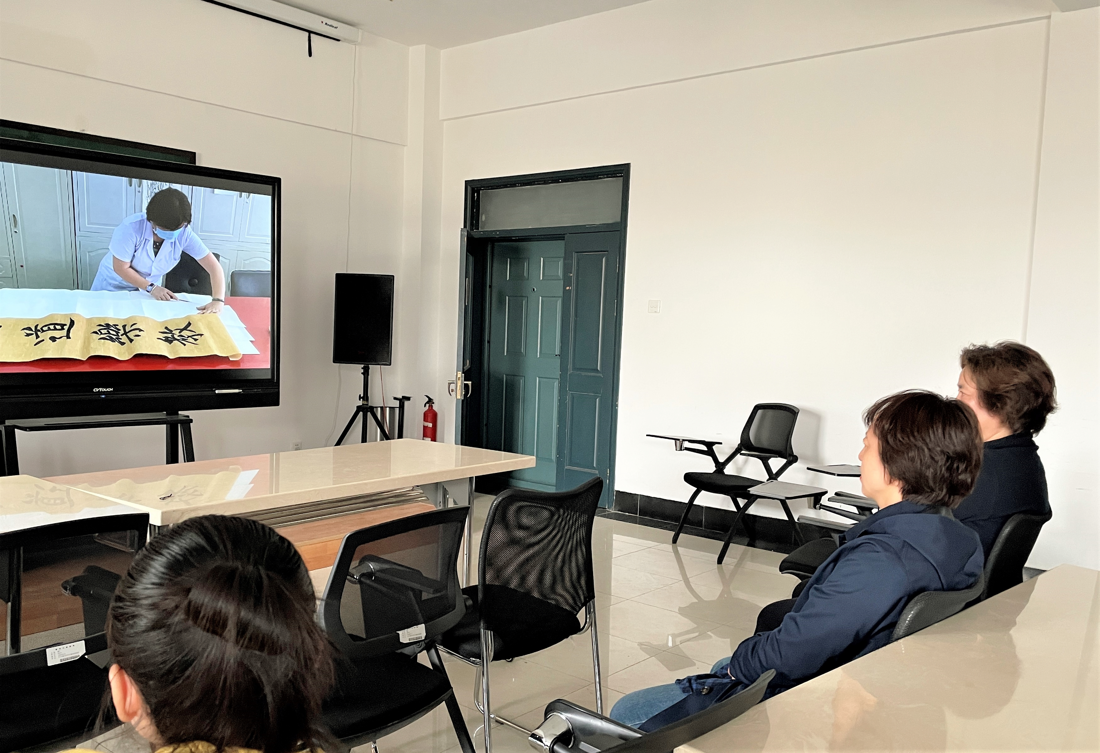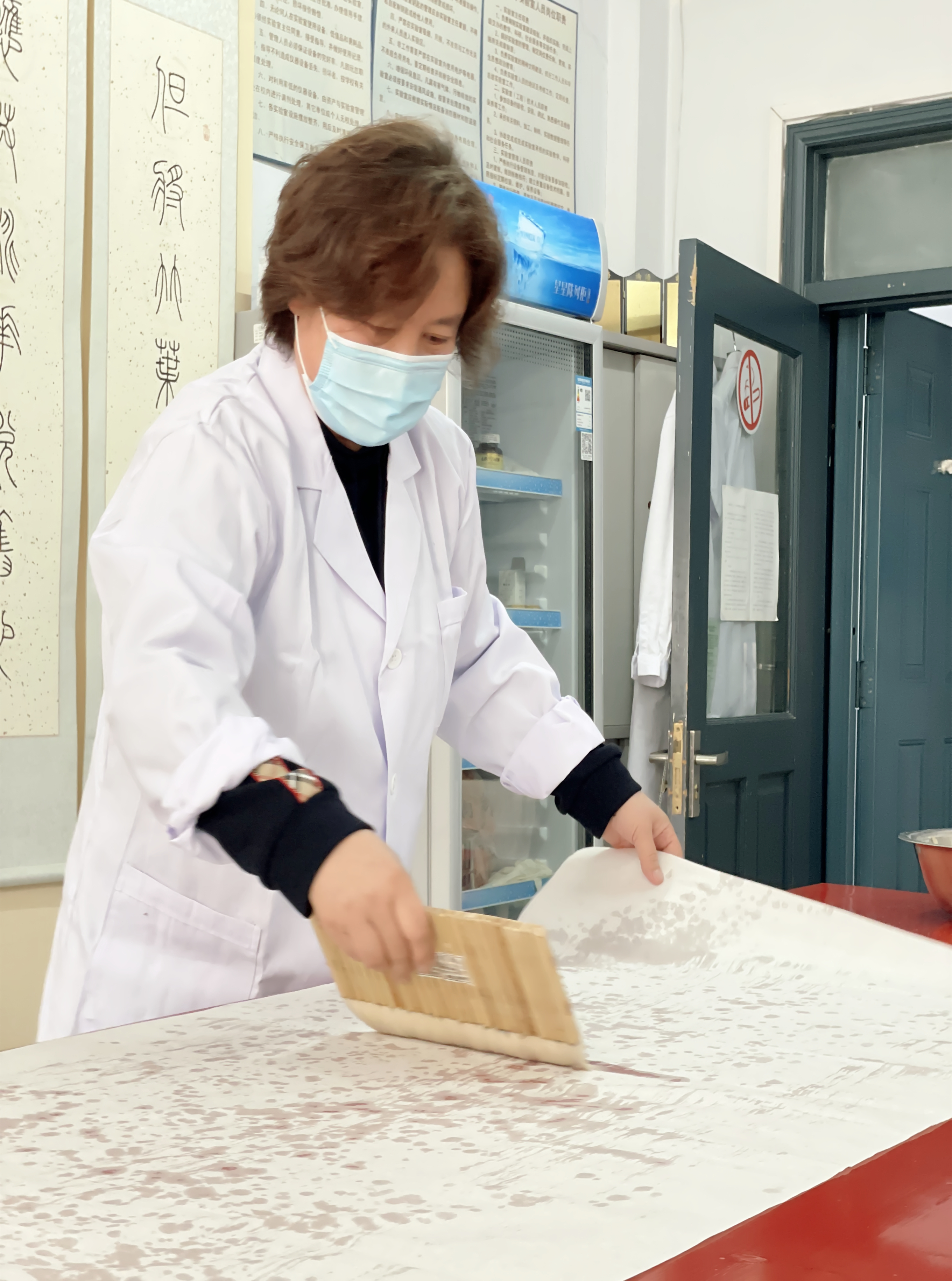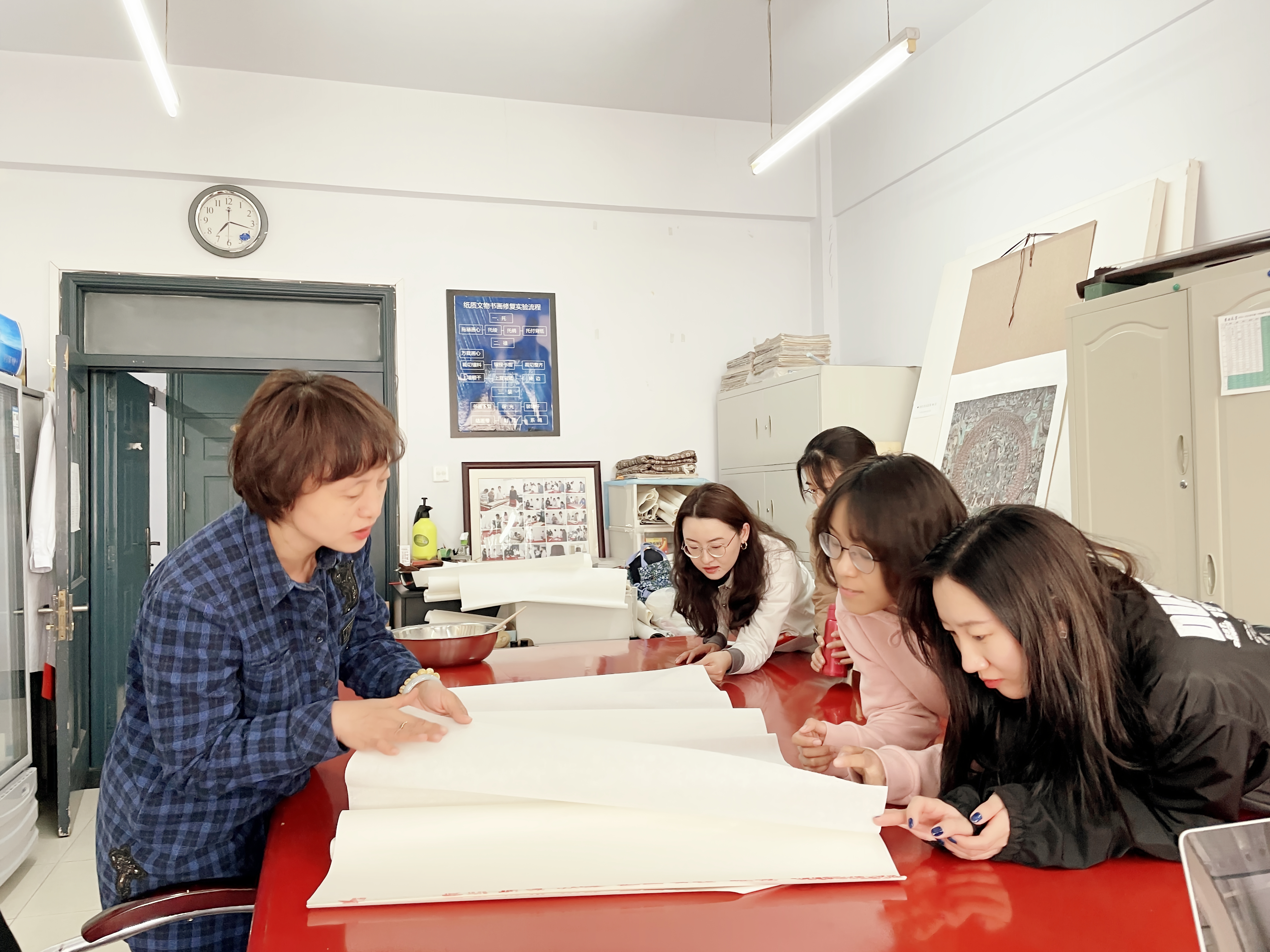 姜晓东先为培训人员播放了曾经录制过的关于书画装裱的基本概念和工具介绍等方面的视频,重点强调了浆糊的制做过程和刷浆时排气不留死褶的重要性,之后带领大家来到书画装裱实验室进行现场讲解,手把手指导大家进行了书画装裱流程的第一部分“托”的操作(托画心、托复背纸)。