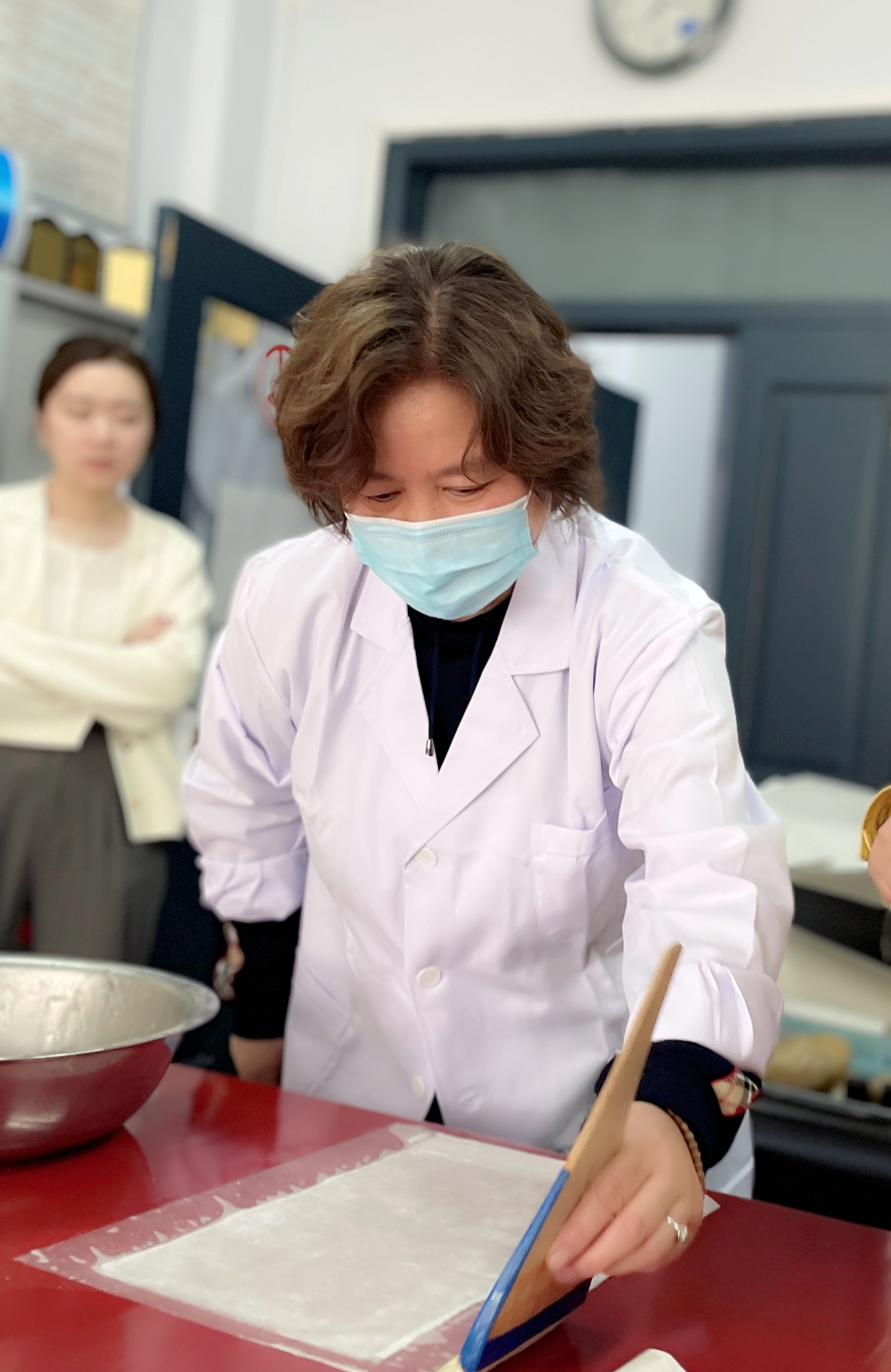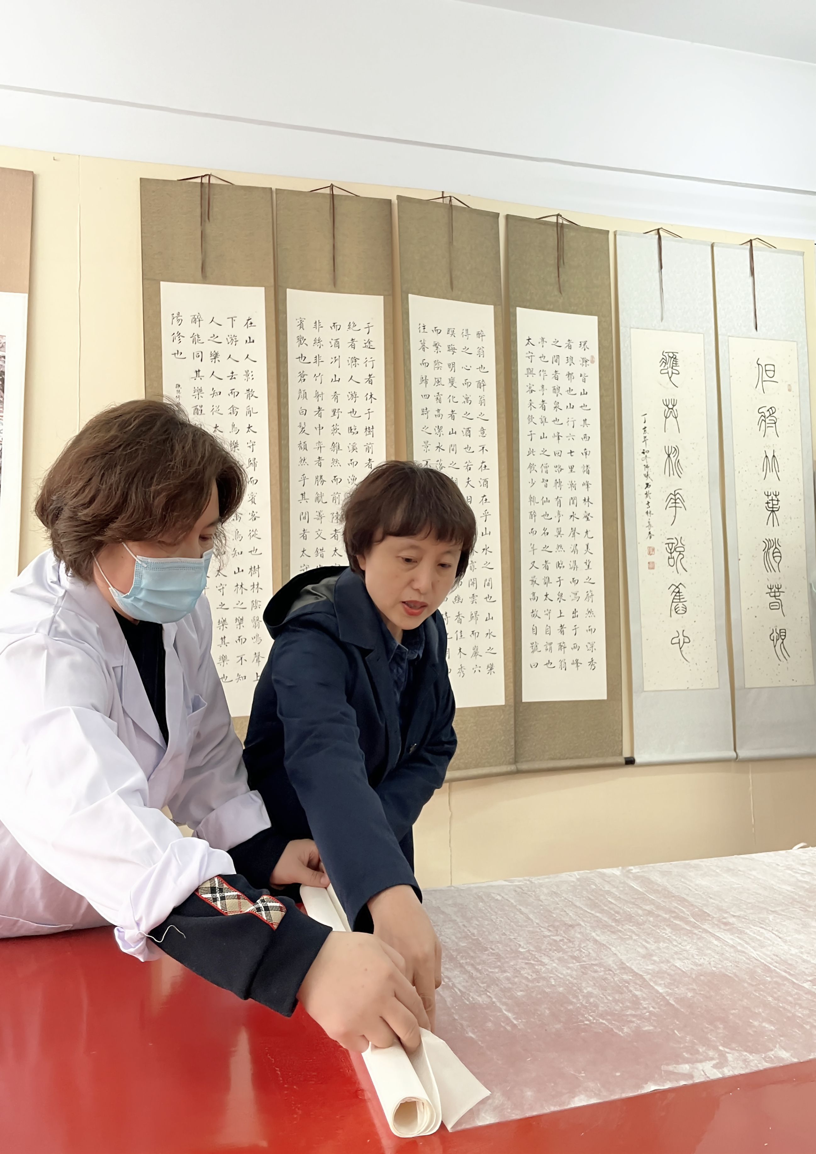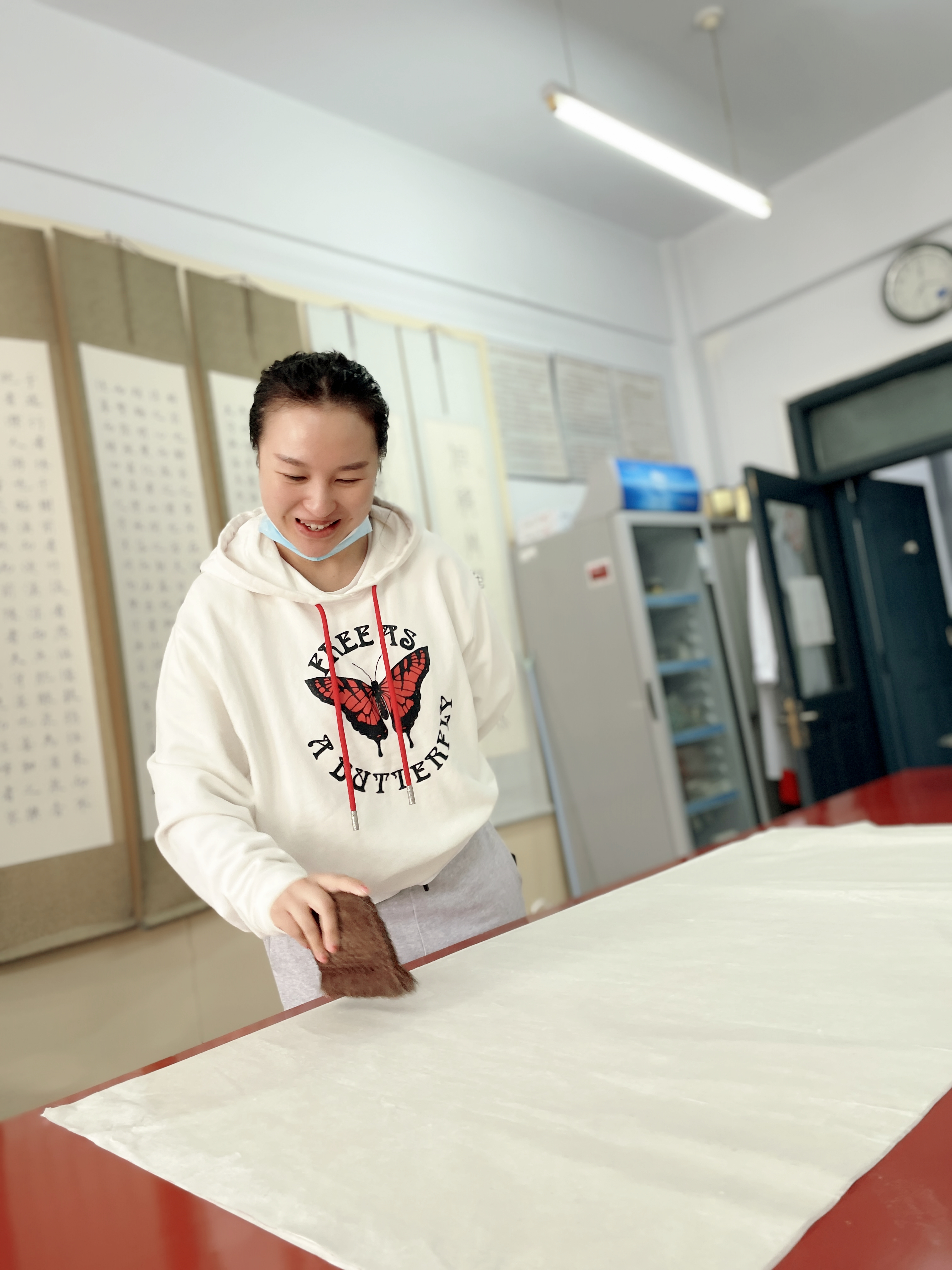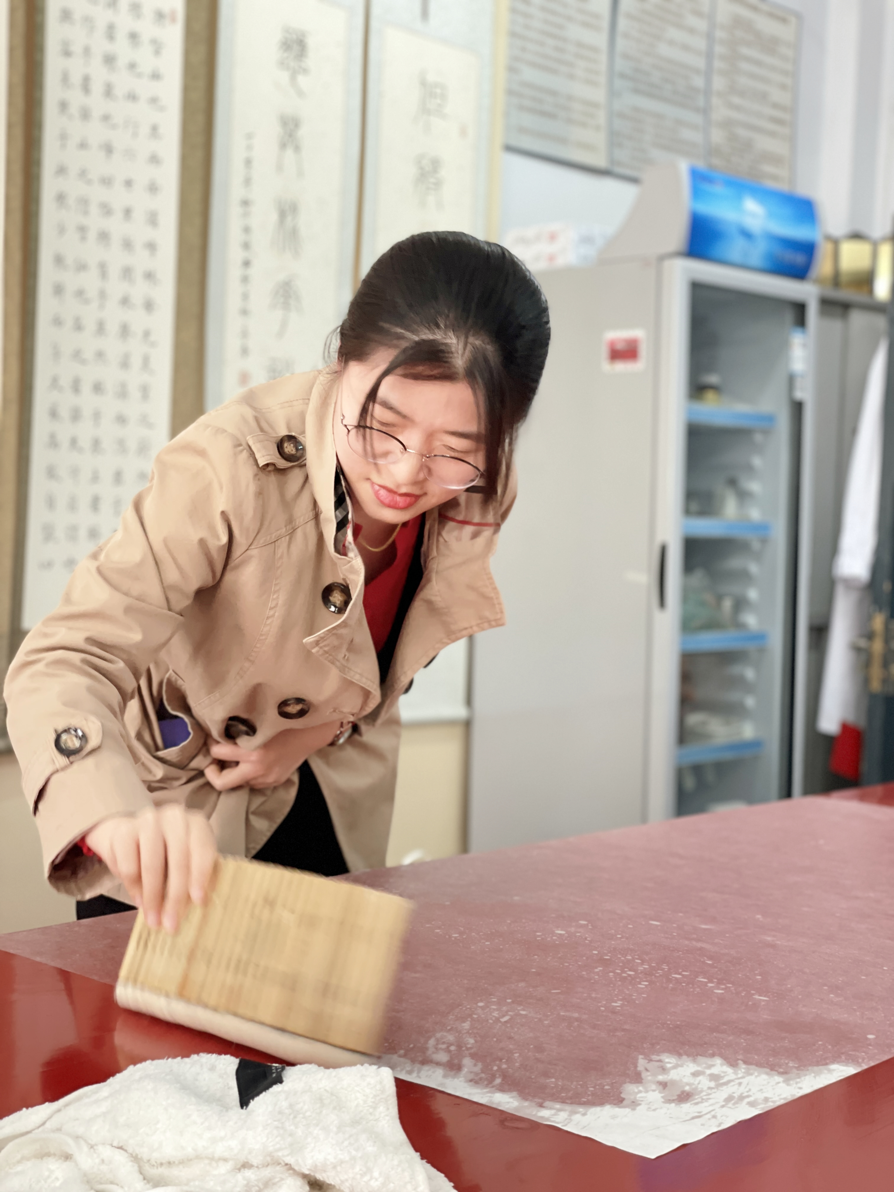 姜晓东先为培训人员播放了曾经录制过的关于书画装裱的基本概念和工具介绍等方面的视频,重点强调了浆糊的制做过程和刷浆时排气不留死褶的重要性,之后带领大家来到书画装裱实验室进行现场讲解,手把手指导大家进行了书画装裱流程的第一部分“托”的操作(托画心、托复背纸)。