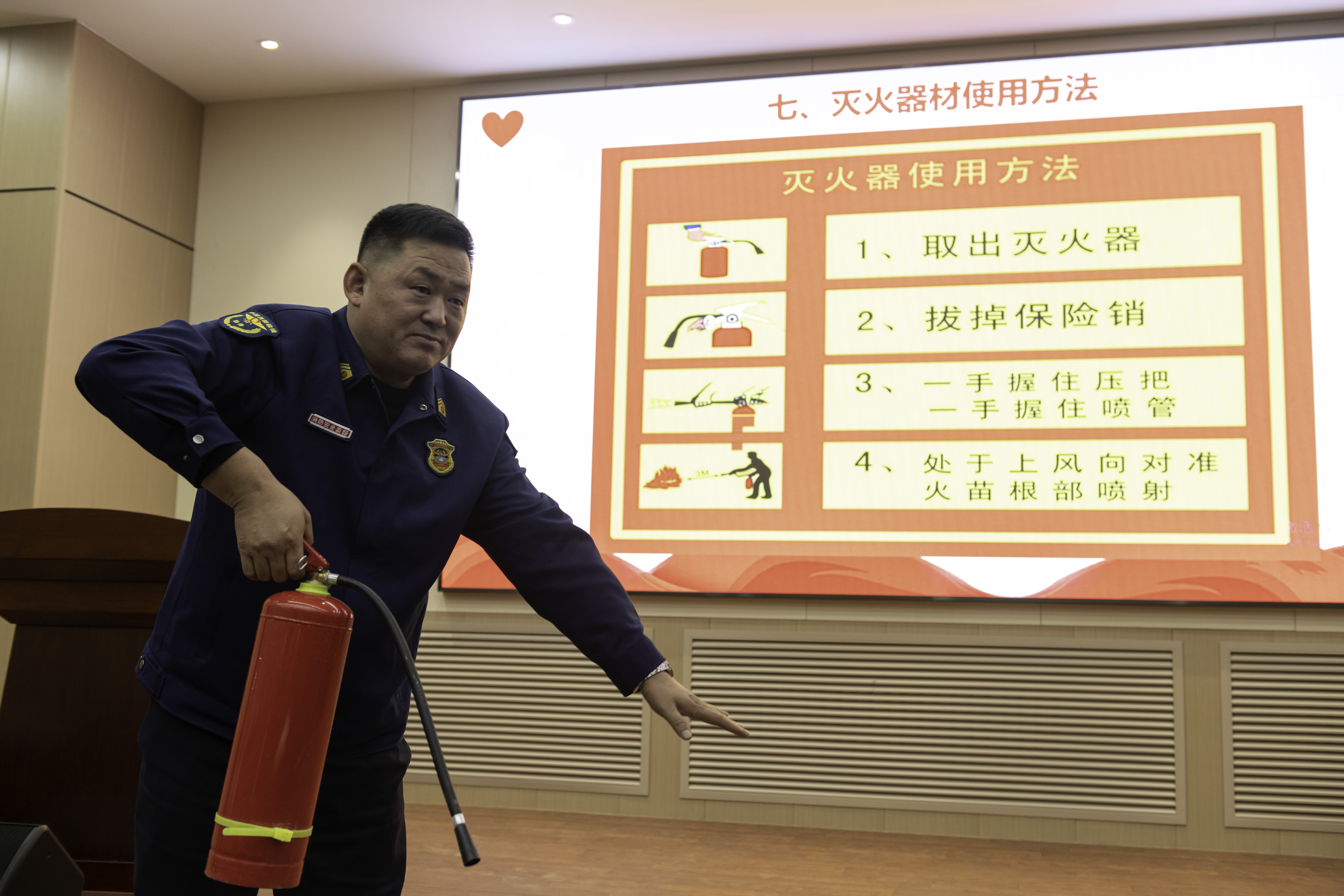 董立明首先通过近几年发生的校园火灾安全事故指出消防安全工作的严峻性,为大家敲响了警钟。然后结合两个学院的实际工作情况,分别针对办公室、实验室、员工宿舍这三个场所的消防安全隐患进行了详细介绍,并为大家演示了灭火器与逃生面罩的使用方法。最后通过一段火灾自救逃生视频,讲解了火灾发生时的逃生技巧与注意事项。