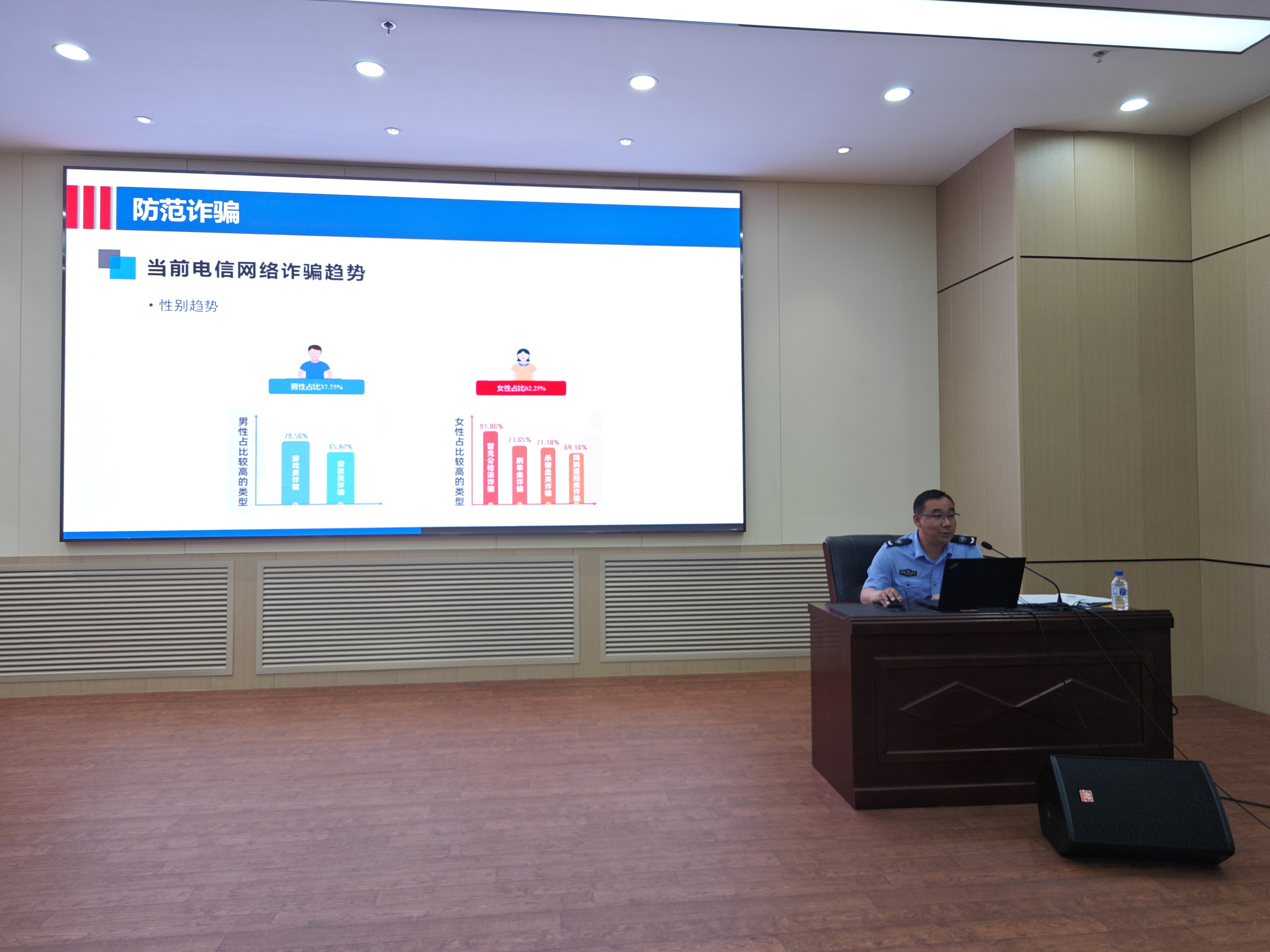 其次邀请保卫处治安科副科长卢阳做防范诈骗知识讲座,围绕冒充公检法诈骗、虚拟绑架诈骗、邮件诈骗、冒充客服(电商)类诈骗、网络刷单诈骗、冒充熟人诈骗、网络游戏虚假交易诈骗、虚拟交友诈骗等8个方面的电信网络诈骗类型,结合具体案例,让大家学会辨别诈骗、防范诈骗。