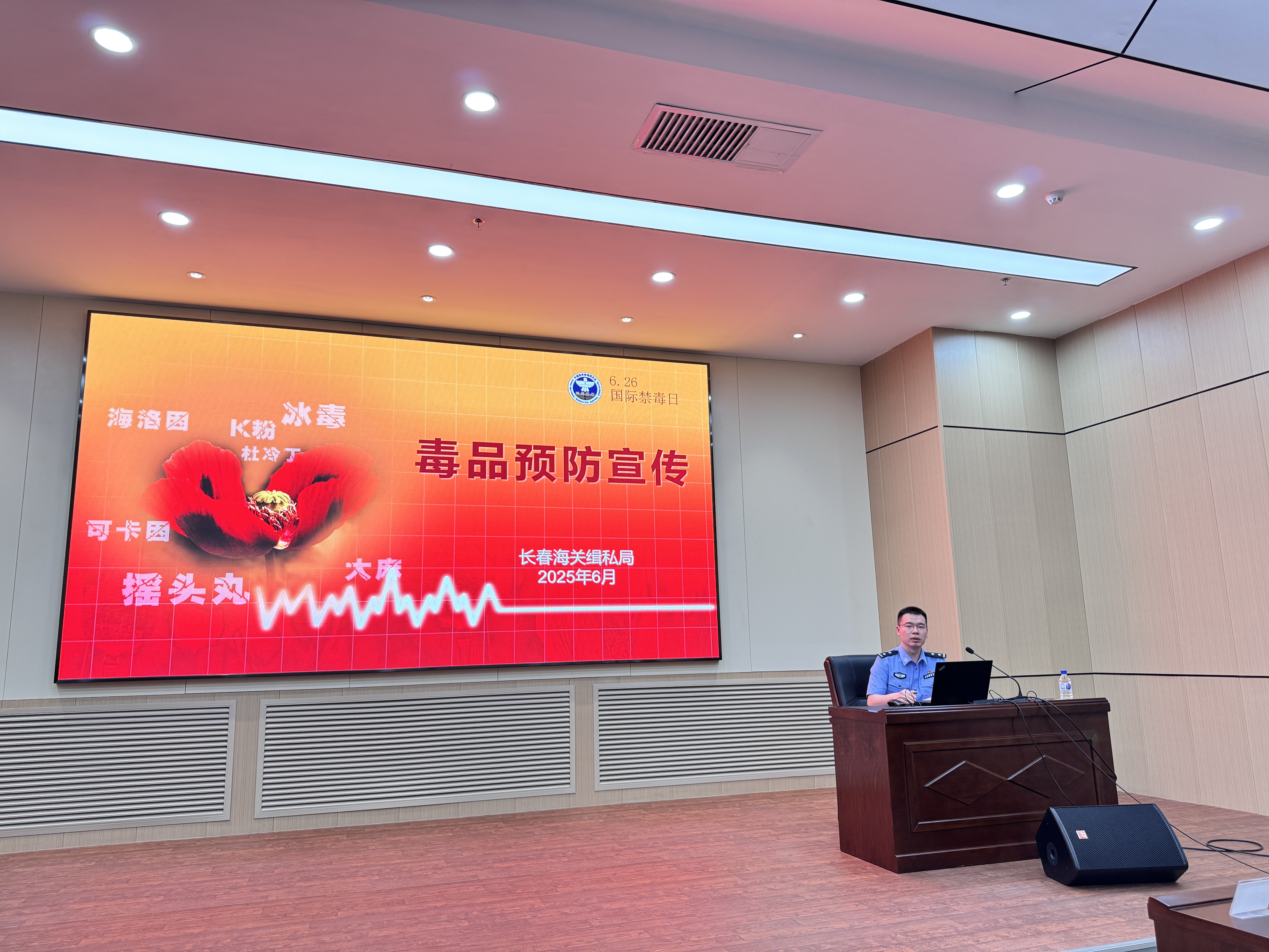 讲座首先邀请长春市人民检察院第二检察部姜云峰检察官做《青春不“毒”行——检察官带你筑牢禁毒防线》主题讲座,邀请长春海关缉私局侦查处姜榆警官做毒品预防宣传教育讲座,两个讲座围绕毒品种类、性状、致病机理,吸毒原因、危害、量刑,如何拒绝毒品等几个方面让大家学会识毒、认毒、拒毒。讲座过后,师生现场观摩了20种常见毒品,加深了对毒品的认识。