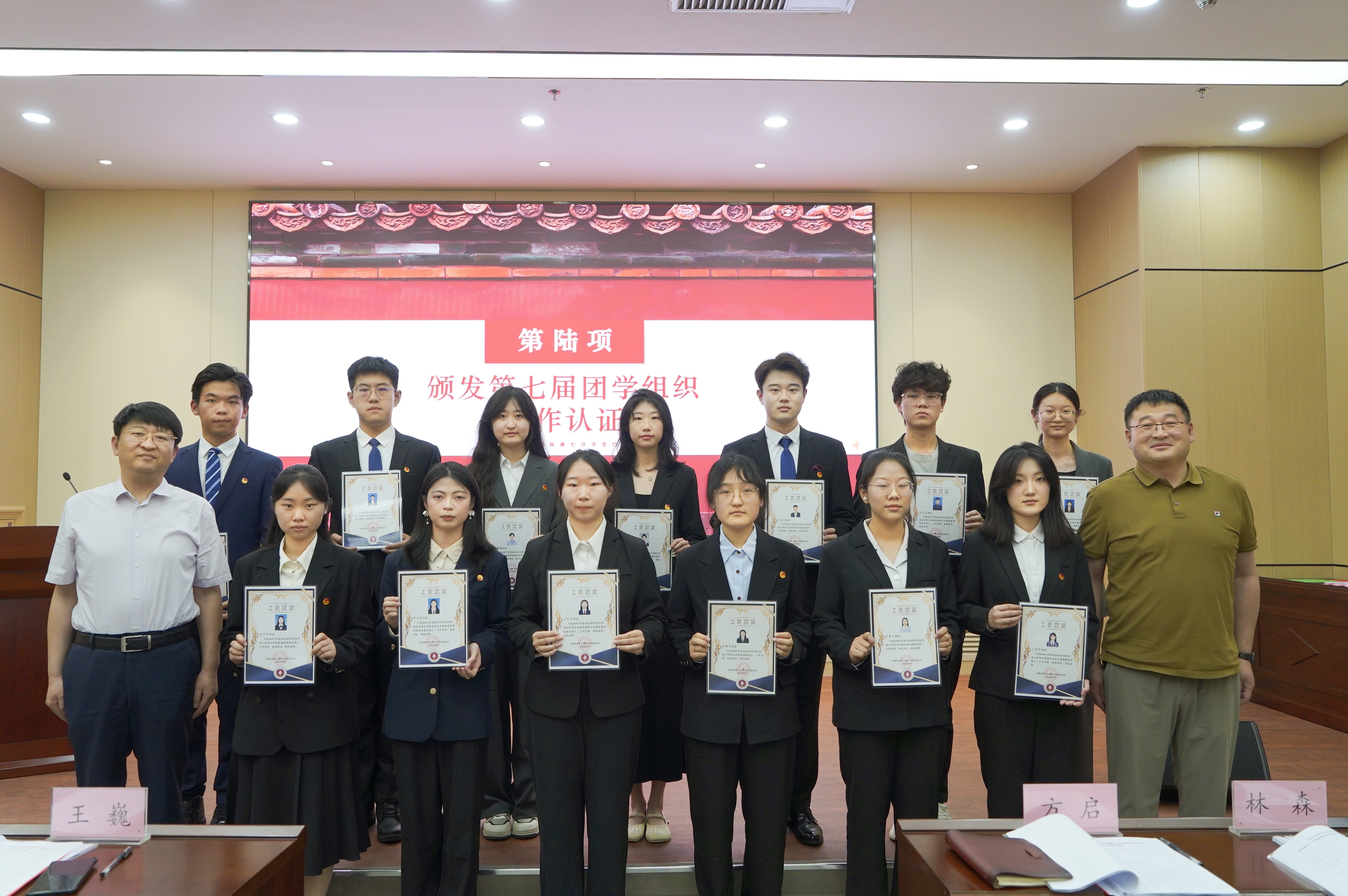 考古公司党委书记王巍、副经理方启为第七届团学组织颁发工作认证。