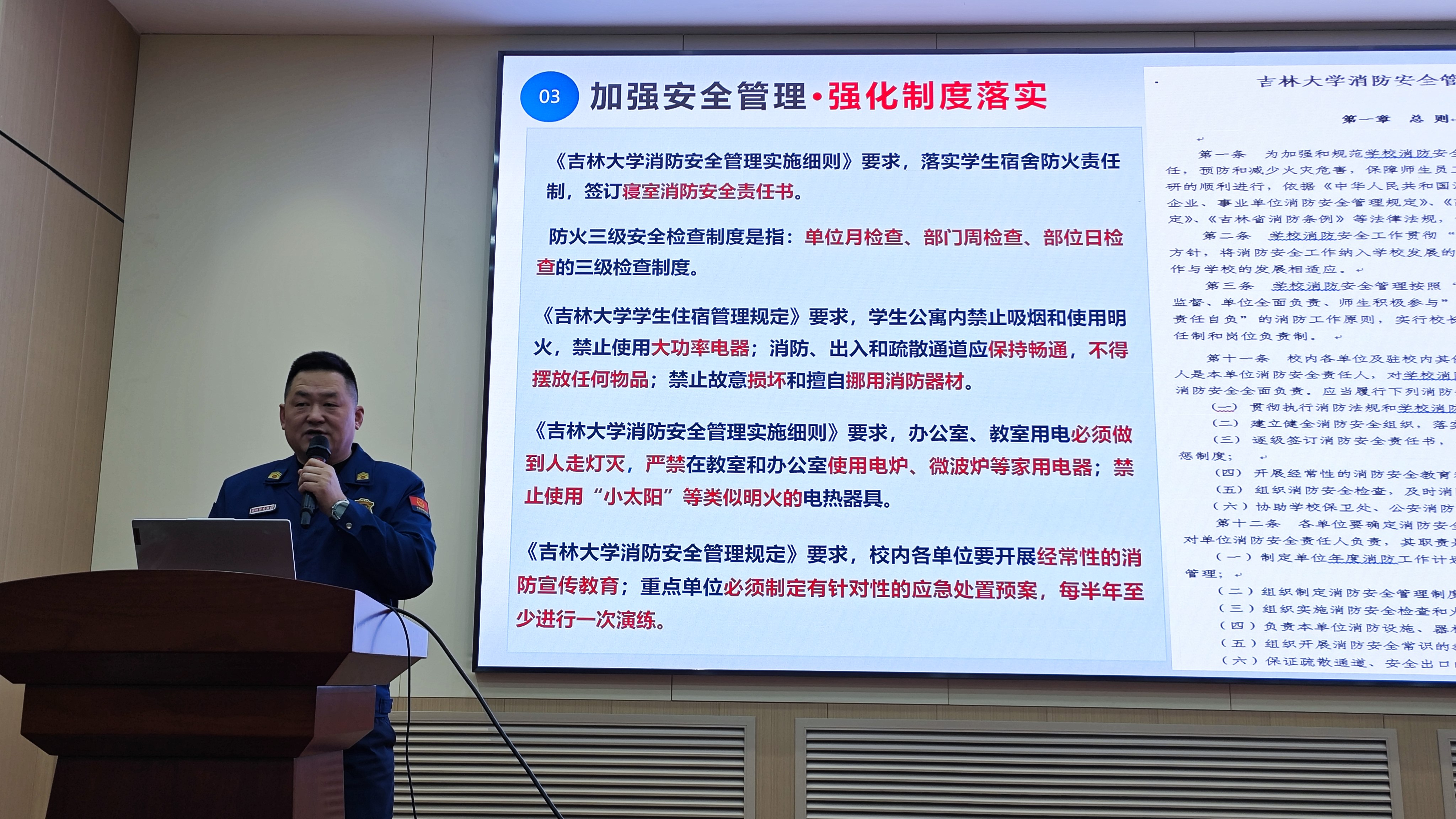 保卫处消防科科长董立明从强化安全意识、校园火灾成因、加强安全管理、夯实四个能力等几个方面做消防安全知识讲座,把火灾案例作为鲜活教材,结合火灾案例复盘总结,教育广大师生以案为鉴,有效落实消防安全防范措施。