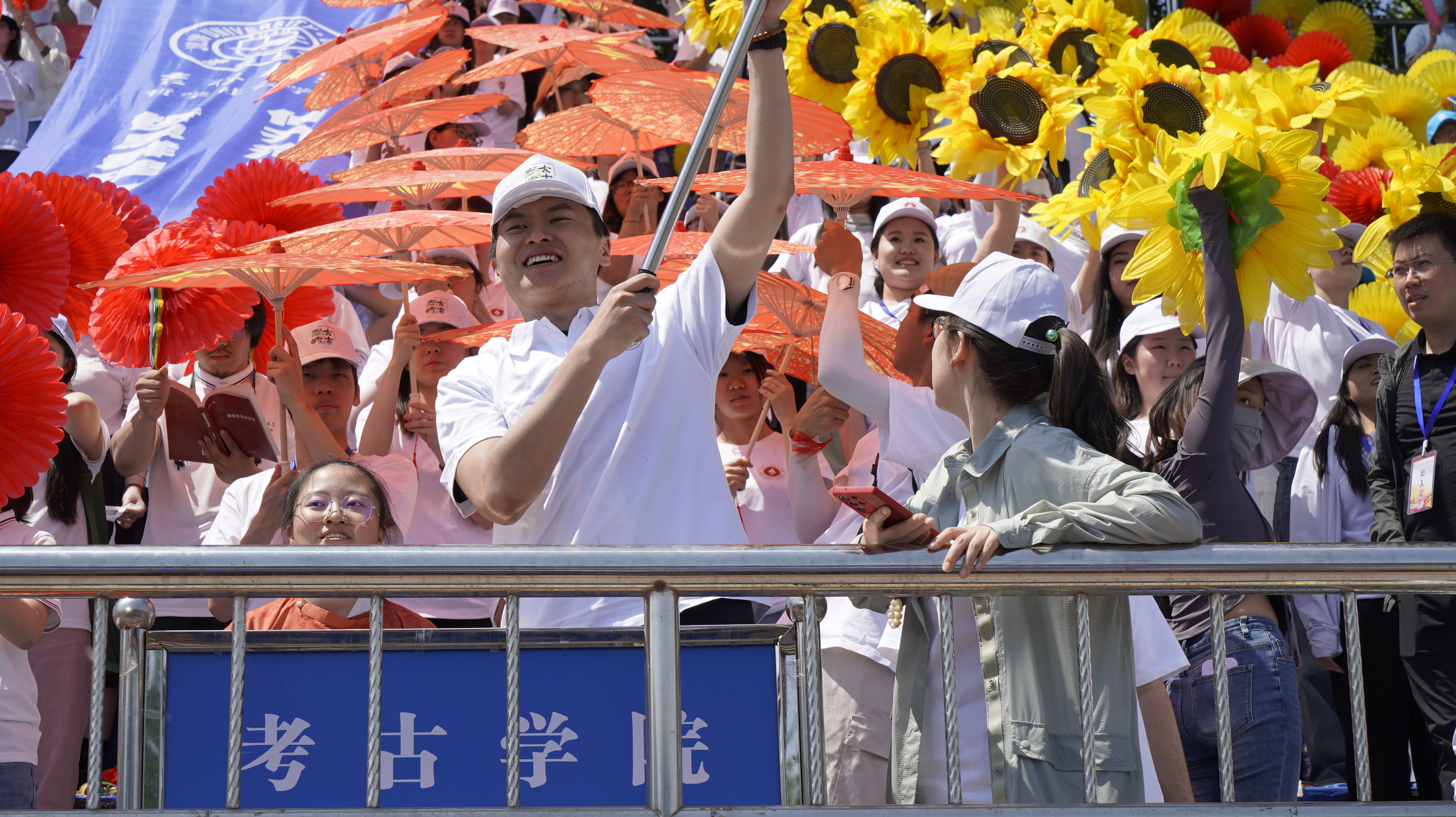 betway西汉姆联平台的42名方阵队员迎着旭日,脚踏微风,步履坚定地走向主席台。方阵到达指定位置,队形整齐划一,精准无误。同学们迅速变换队形,两把团扇轻盈地一合一开,画卷缓缓展开;画卷中央,8名队员头戴草帽,身着工地马甲,握持手铲,环绕探方模拟考古发掘;与此同时,油纸伞与纸鸢相继登场,寄托着对中国考古事业繁荣发展的美好祝愿,汉服的多样性更是将中华文化的博大精深充分地展现出来。当汉服表演落下帷幕,模拟发掘两侧的队员纷纷向中央抛出彩带,宛如庆祝的烟花,象征着考古学子对传承发展考古文博事业的决心与期待。