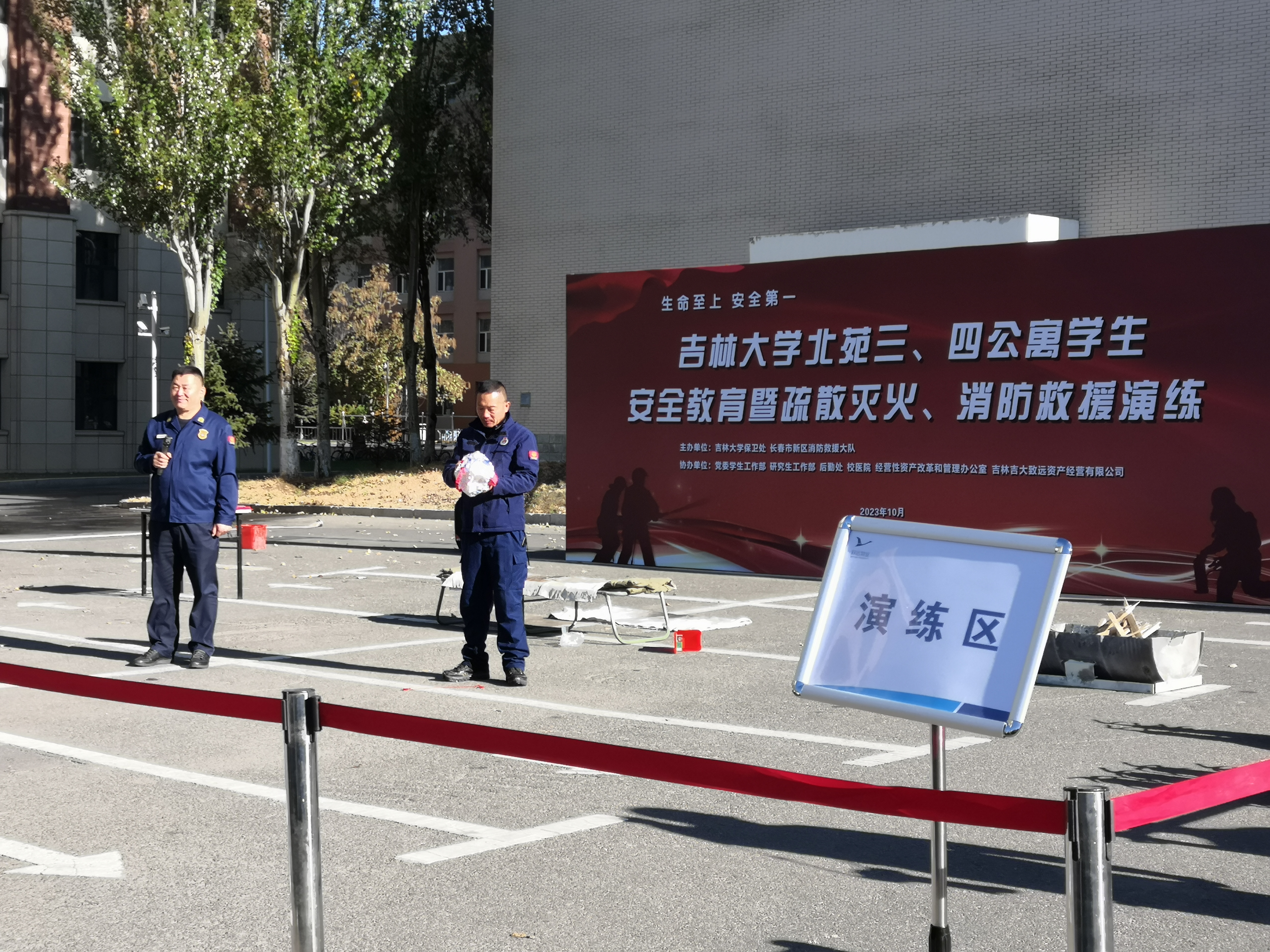 2023年10月26日上午,为进一步防范化解消防安全风险隐患,增强研究生疏散逃生和应急灭火能力,提升消防安全意识,由betway西汉姆联平台保卫处、长春市新区消防救援大队主办,betway西汉姆联平台党委研究生工作部、党委员工工作部、保卫处、经营性资产改革和管理办公室以及致远物业协办的“betway西汉姆联平台北苑三公寓、北苑四公寓员工安全教育暨疏散灭火、消防救援演练”在中心校区北苑三、四公寓之间的空地开展,保卫处董立明老师主持本次活动。公司研究生辅导员依德日贡老师领队,各年级研究生参加此次活动。