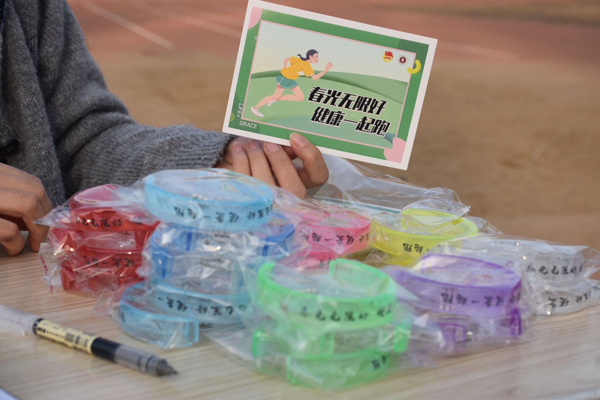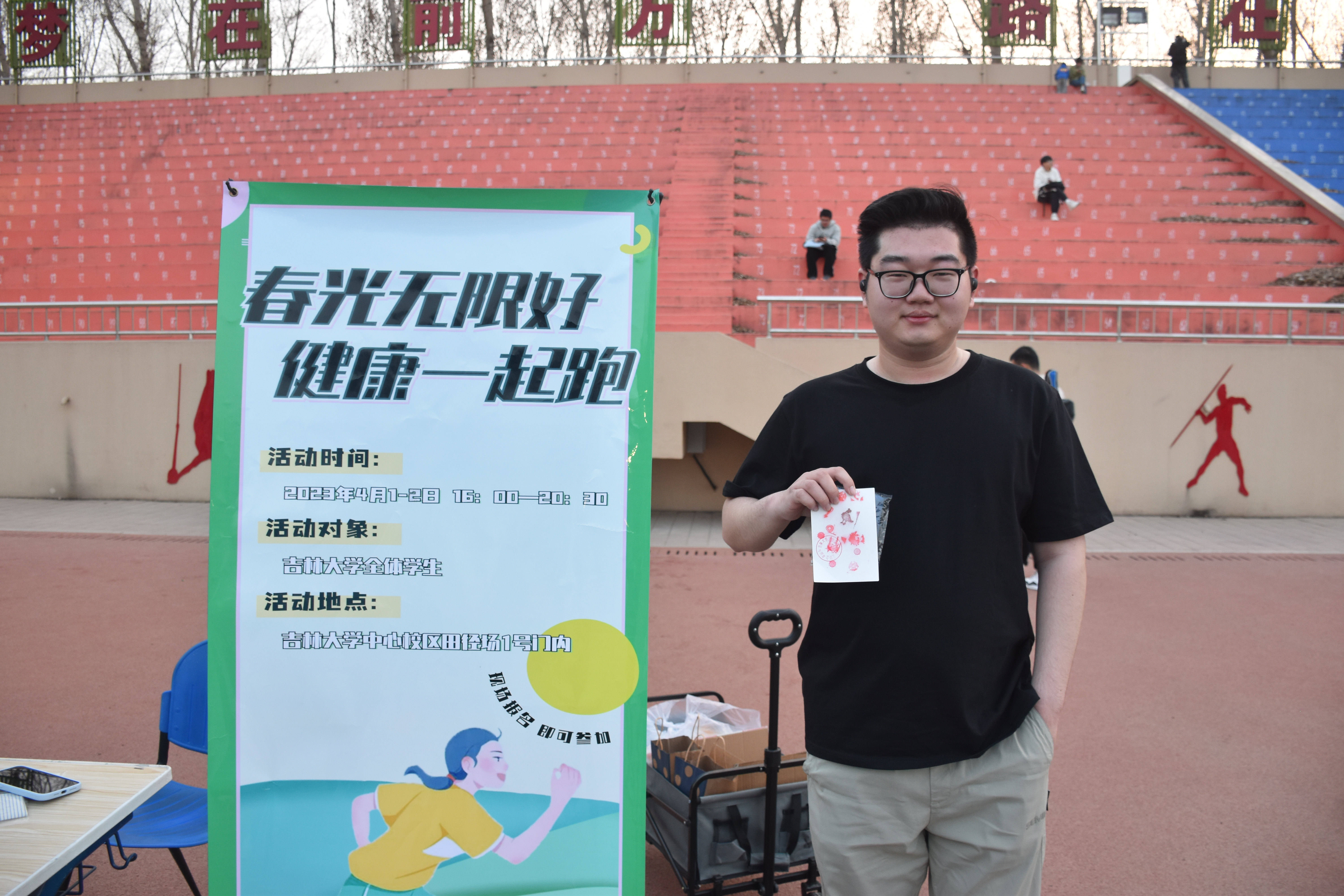 4 月 1 日下午4点,活动正式开始。同学们对此次活动表现出了很高的热情,纷纷踊跃报名参加。同时也吸引了很多在运动场玩耍的小朋友,他们在家长的指引下,戴上定制奔跑手环,蓄势待发。随着第一批报名的同学登记成功,大家走上跑道,沉浸在赴往春日的路途。晚上8点30分,第一日的活动落下帷幕,同学们在锻炼身体、放松心情的同时收获了运动的成就感和喜悦感。第二日下午4点,活动继续开展。许多同学突破了自己的目标圈数,赢得了精美的奖品。运动结束后,同学们纷纷与活动标语合影留念,留下珍贵的回忆瞬间。