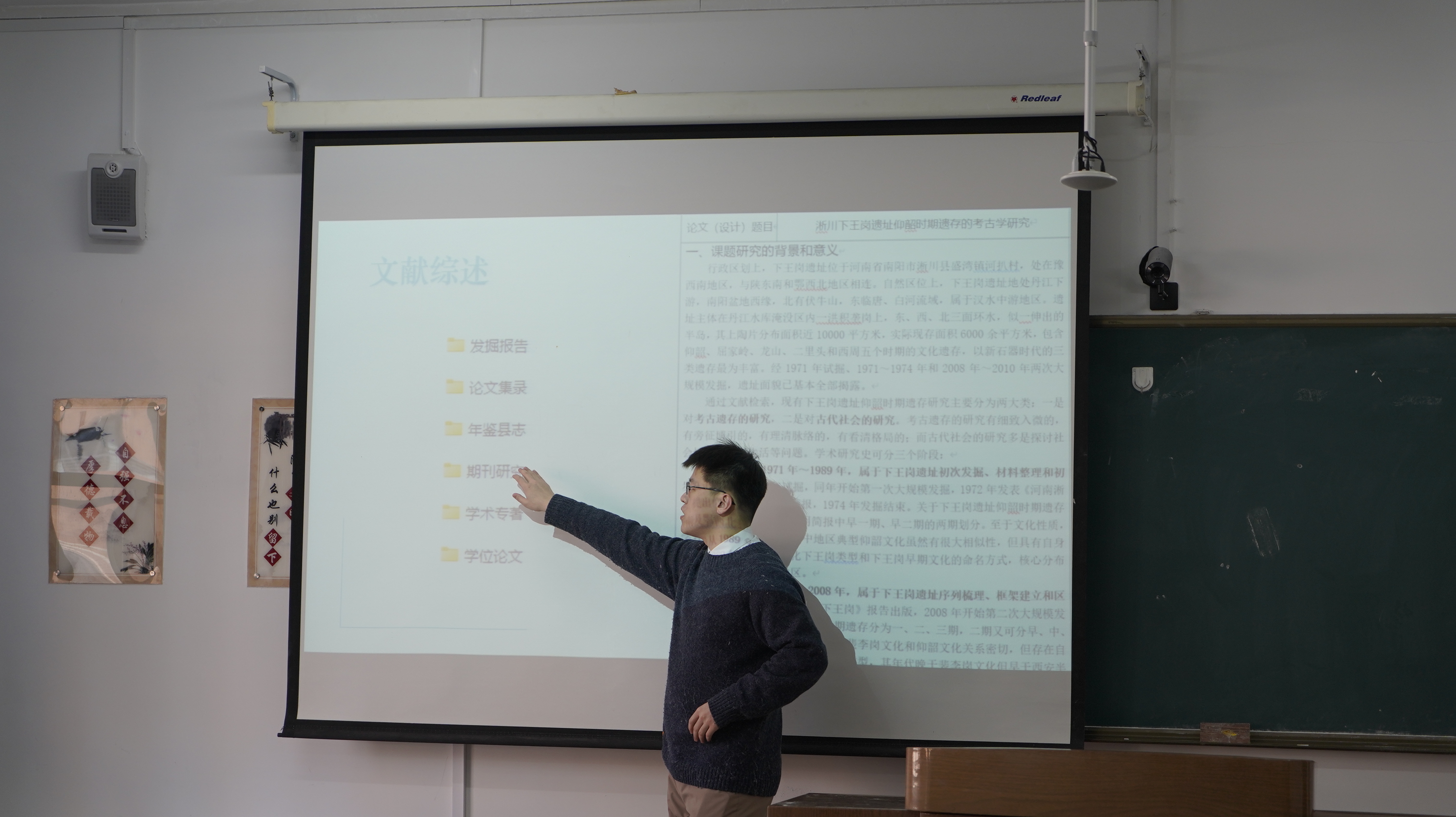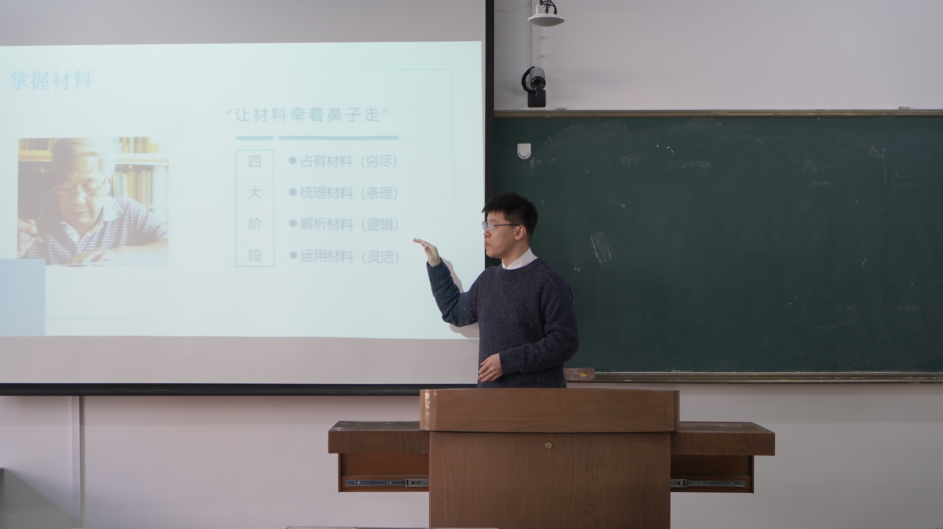 田玉峰同学以“学而思之,行以致远”的总标题开篇,从写作流程,文献综述,具体研究,论文构成和论文修改五个方面向同学们进行具体介绍。田玉峰同学首先展示了毕业论文写作的基本流程及选题分类与标准,并将标准总结为“适当”两个字。其次,引用张忠培先生的话“让材料牵着鼻子走”,提出掌握材料的四大阶段。再次,提出论文的组织基础:理论方法范式到实践,并具体阐释了理论与方法的区别。接着,将论文构成简要概括为名、文、图、表、注,提出框架、内容和逻辑三方面,并传授模仿的技巧。田玉峰同学还强调了修改的重要性,提出重复的意义与追求完美的意识。之后以自己的毕业论文为例,设身处地的对以上步骤进行举例。最后,田玉峰同学以学思笃行寄语同学,对如何度过充实的老员工活提出建议,希望大家做到学而思之、思而行之、行而再学。