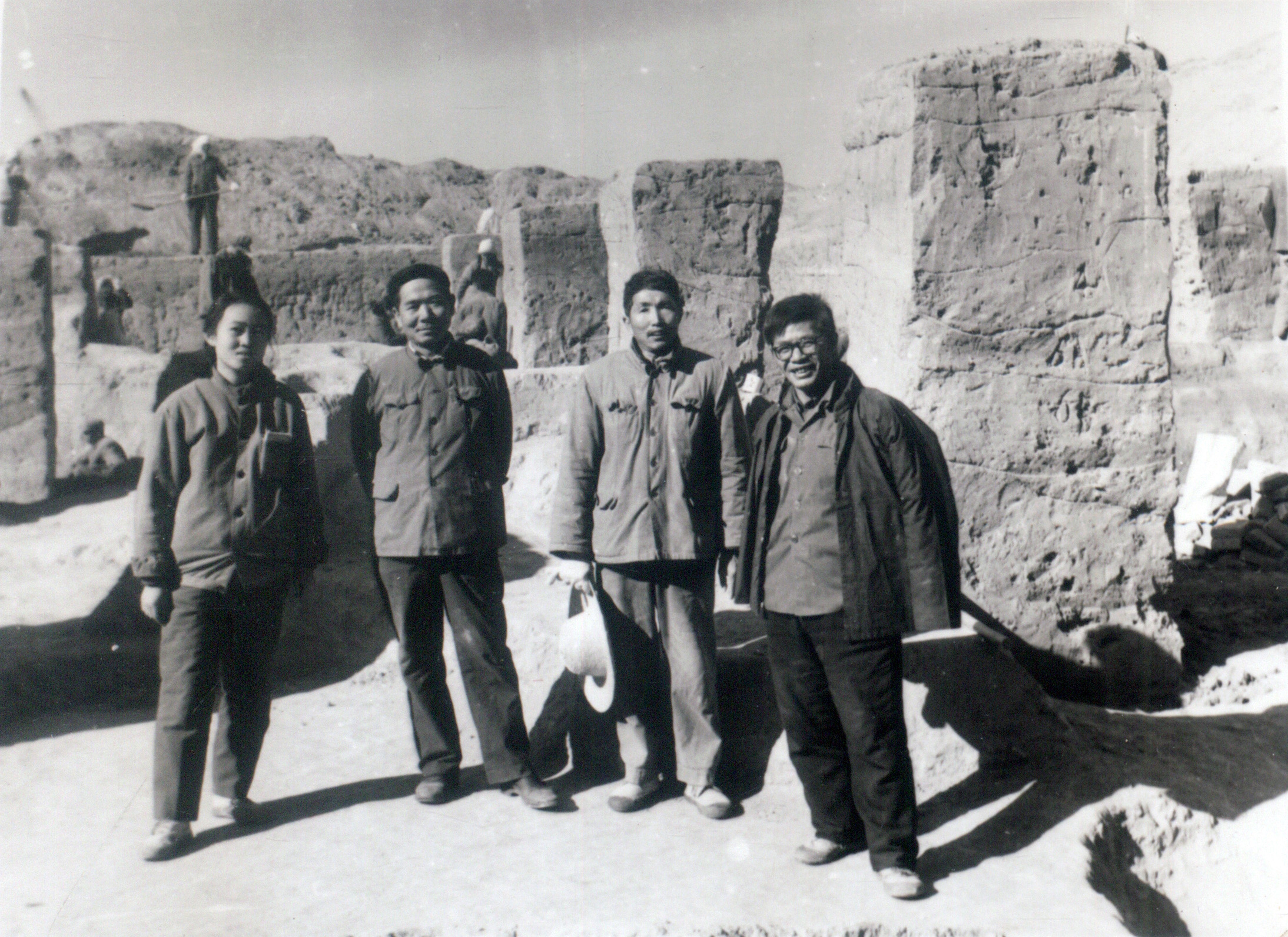 图四 白燕遗址合影(左起杨建华、王克林、黄景略、张忠培)