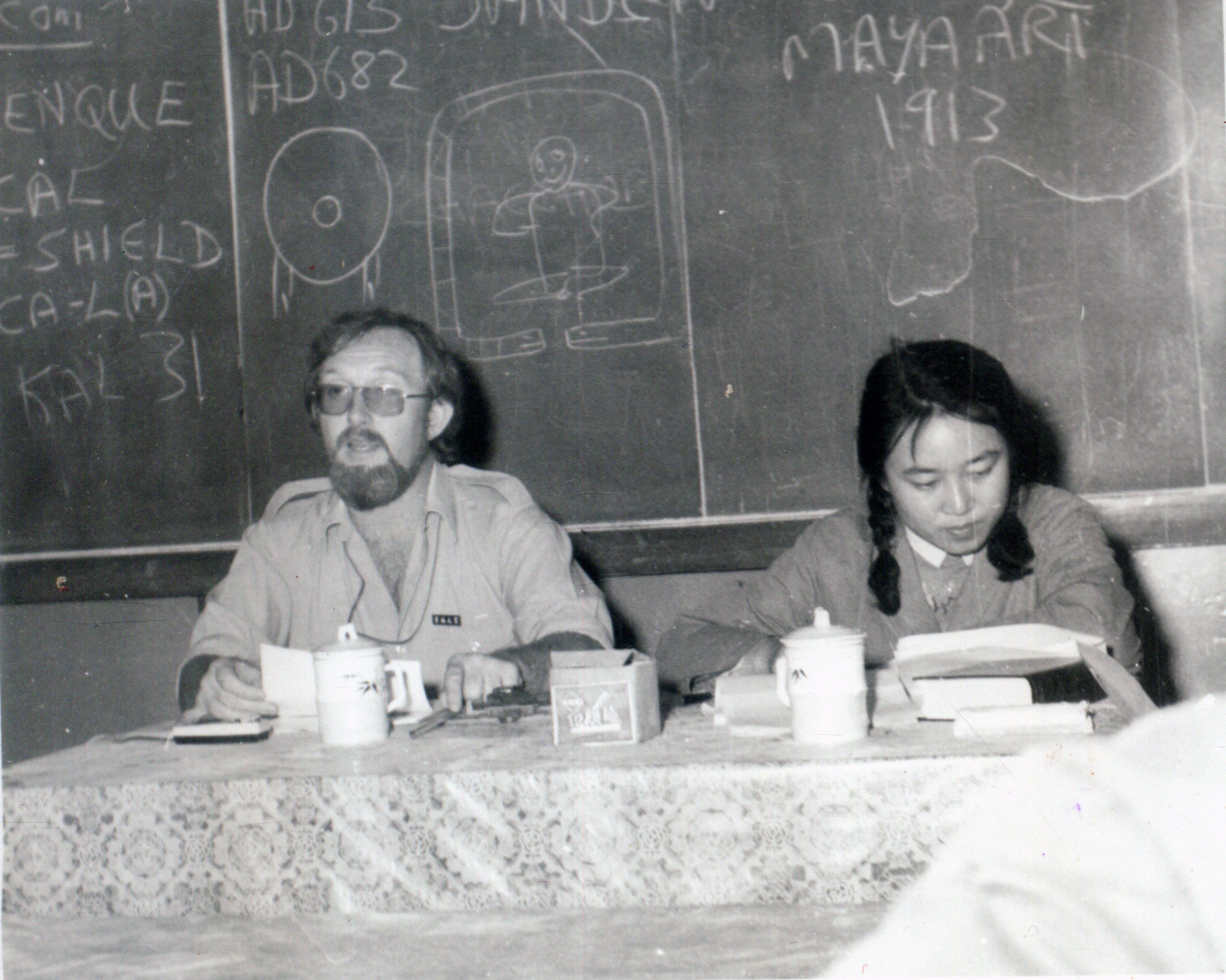 大学毕业后,杨老师留校进入外语系学习了两年,并在全校文科教师外语考试中获得第一名。随后杨老师承担了诺曼·哈蒙德教授(Prof. Norman Hammond)的翻译接待工作,并圆满完成(图三)。外语学习也决定了杨老师硕士学习的方向为西亚考古。