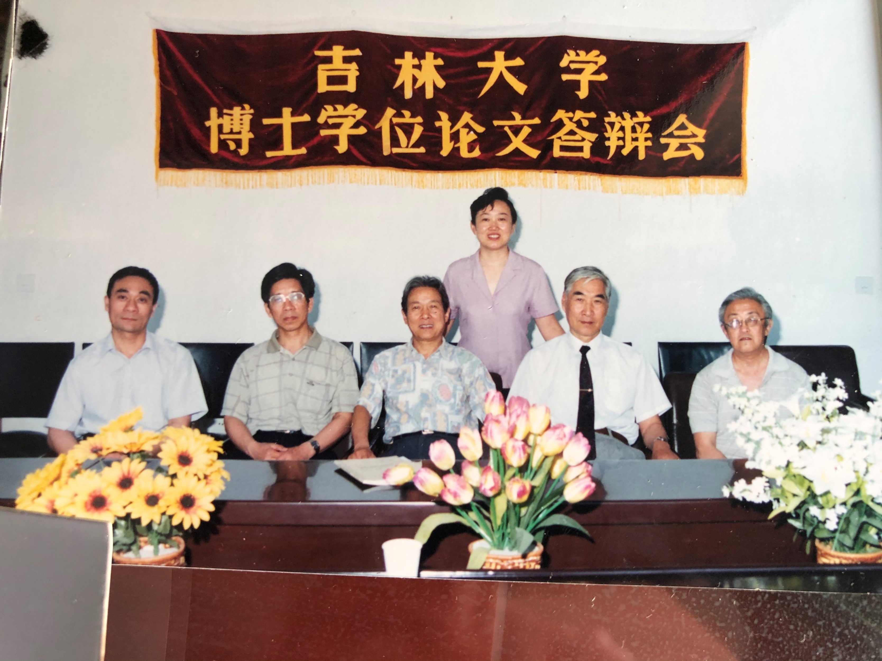 图九 博士论文答辩合影(坐者左起朱永刚、魏存成、李伯谦、方起东、林沄)