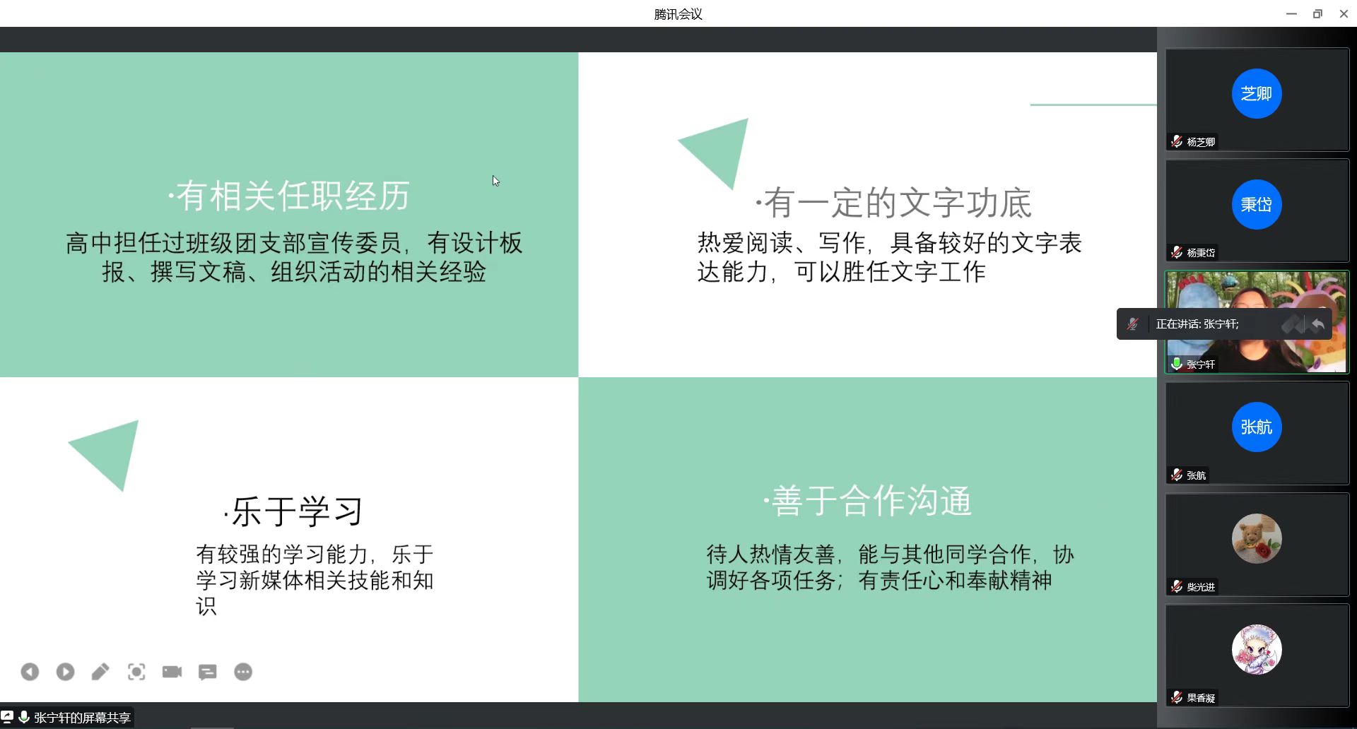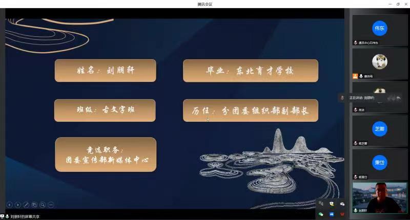根据当前学校的相关防疫政策,本次纳新面试通过腾讯会议于线上举行 。为保障纳新过程顺利进行,团学组织相关负责人针对本年度报名情况制定出合理的考核方式和考核标准,向各纳新部门征集面试问题,并召开线上会议进行面试官培训。上午9时,参与面试的同学按照编号顺序,依次进入等候室和会议室进行面试。本次面试分为自我介绍和个人答辩两个环节。参加的同学首先通过PPT等形式,分别从个人简介、岗位认识、竞选优势、工作设想等方面进行时长三分钟的竞选演讲。在此环节中,每位同学都充分展示了自己在性格、能力、工作经验等方面的竞选优势,不吝表达了对所报名的职务的工作任务的设想与规划,尽显为学院奉献、为同学服务的决心和对后续工作的展望。在随后的个人答辩环节,面试官结合同学们的自我陈述内容和竞选岗位的工作内容及特点,向同学们有针对性地提出了一些问题,引导同学们重新思考工作与学习的关系、协同工作的意义等关键问题。通过时长一分钟的答辩,面试官进一步加深了对竞选者的了解,同学们也对团学组织有了更深刻的认识。整个面试流程中,应试同学和面试官紧密配合,每位同学之间衔接有序,共同取得了良好效果。中午12时30分,纳新面试圆满结束。