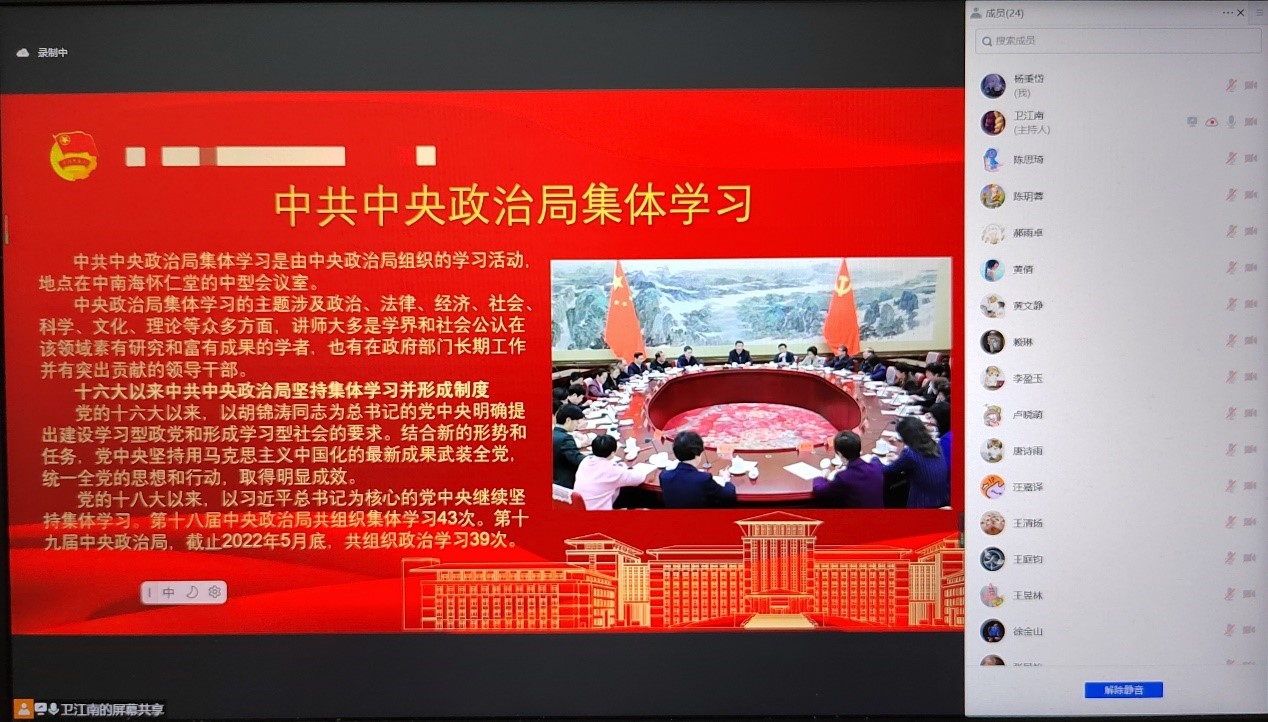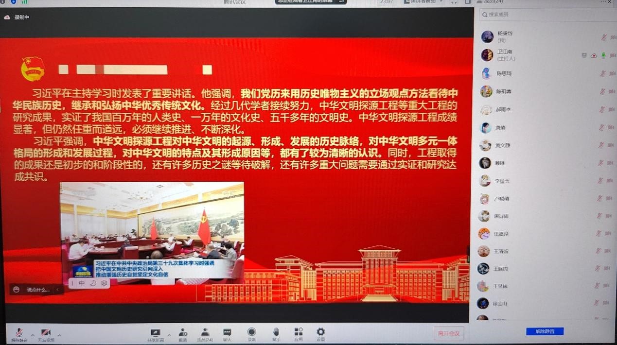 为加强入党积极分子教育,深入学习习近平总书记重要讲话精神,引导入党积极分子增强历史自觉,坚定文化自信。2022年5月30日晚,betway西汉姆联平台团委召开了线上主题党日活动。活动就中共中央政治局就深化中华文明探源工程进行第三十九次集体学习的会议内容开展了学习与交流。此次活动由betway西汉姆联平台团委常委卫江南主持,学院本科生党支部全体入党积极分子参加。