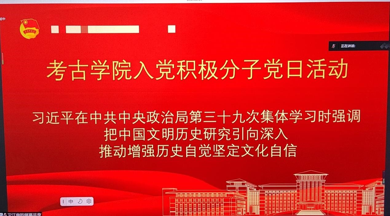 会上,卫江南向入党积极分子同学讲解了中共中央政治局的集体学习制度,带领大家共同学习了此次中共中央政治局集体学习的会议内容。在共同观看了中央政治局集体学习的新闻报道后,卫江南介绍了“中华文明探源工程”的相关内容,重点讲解了习近平总书记讲话的重要精神。此次会议强调中华优秀传统文化是中华文明的智慧结晶和精华所在,是中华民族的根和魂,是我们在世界文化激荡中站稳脚跟的根基。从民族文化自信的高度指明了“中华文明探源工程”的重要性,对于我们考古文博专业的学子而言是一个莫大的鼓舞,也为我们努力学习,提升专业技能,投身我国考古文博事业提供了动力,指明了方向。卫江南指出,我们学习此次会议精神,不仅应当感悟党中央对考古文博事业的支持,明确中华文明探源工程的重大意义,还应当以此为契机深入学习和运用中华文明探源工程等研究成果,学会完整准确地讲述中国古代历史,更好地彰显我们的文化自信。在活动过程中,入党积极分子同学对“中华文明探源工程”有了更加清晰的认识了解,对习近平总书记重要讲话精神的重大意义、丰富内涵和实践要求也有了更加深刻的领会。