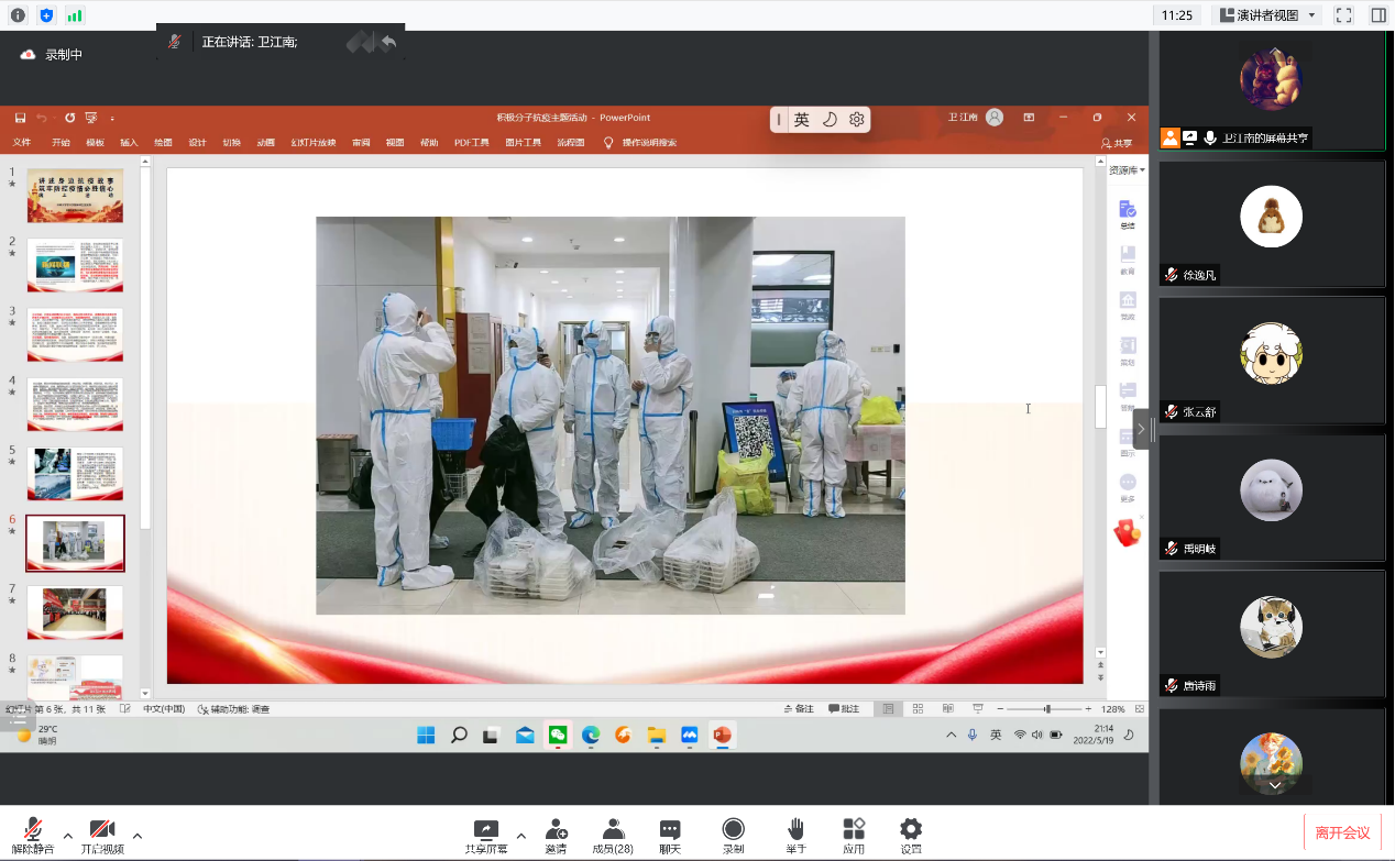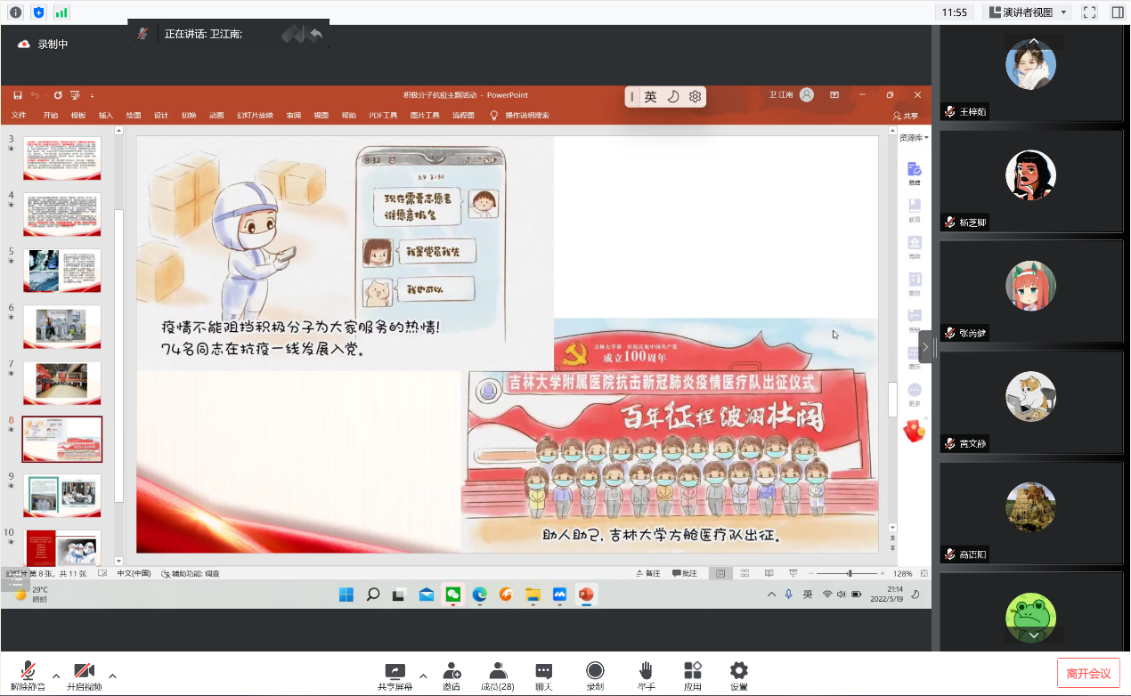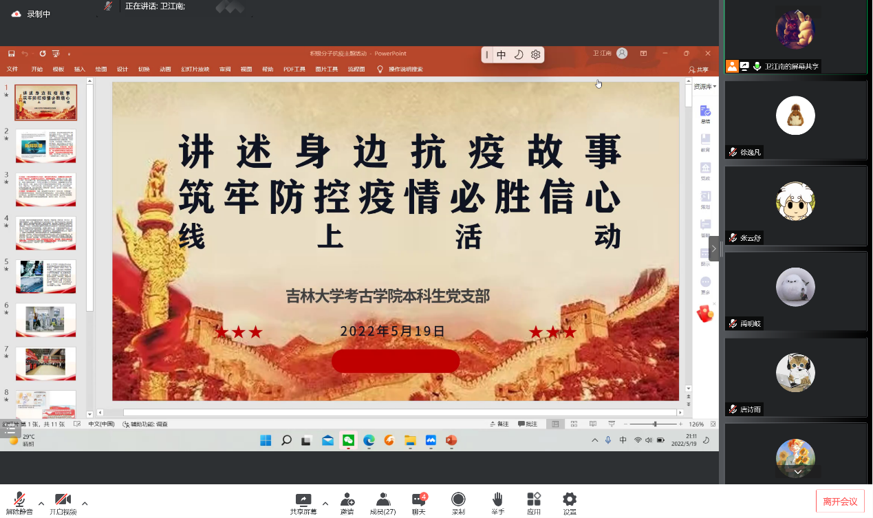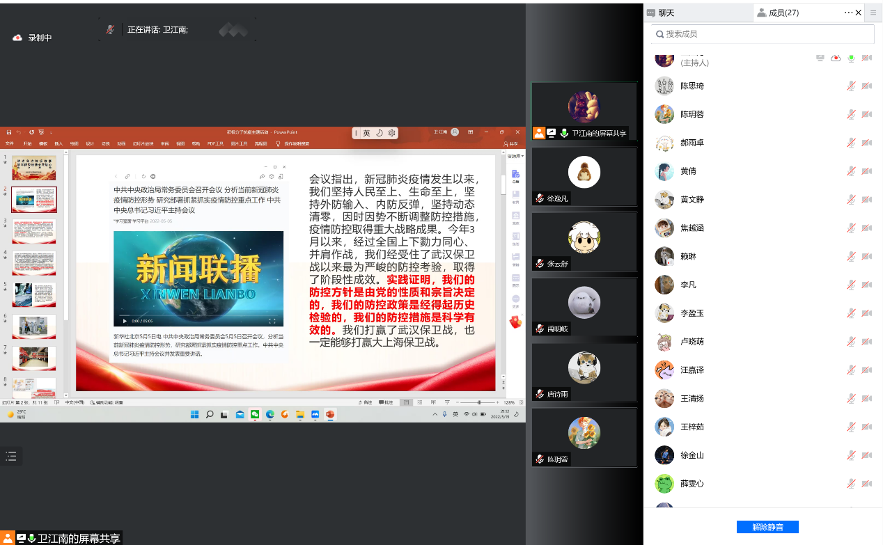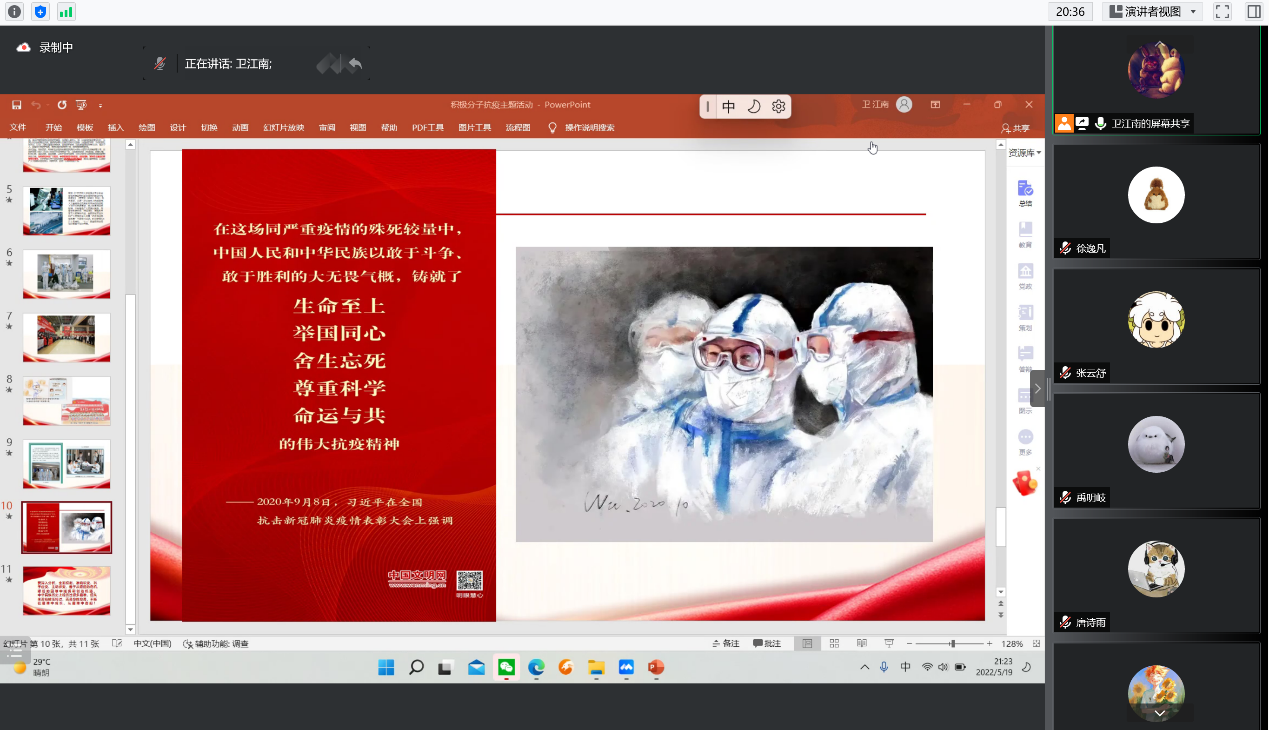 为进一步弘扬伟大抗疫精神,加强入党积极分子教育,引导广大入党积极分子提高思想认识,对标先进典型,端正入党动机,2022年5月19日晚,betway西汉姆联平台本科生党支部组织入党积极分子开展了“讲述抗疫故事,筑牢防控疫情必胜信念”线上主题党日活动。活动由2020级考古班团支书卫江南主持,学院全体入党积极分子参加了此次活动。活动共分两部分,一是深入学习习近平总书记5月5日在中央政治局常委会会议上的重要讲话精神,二是讲述身边的抗疫故事。