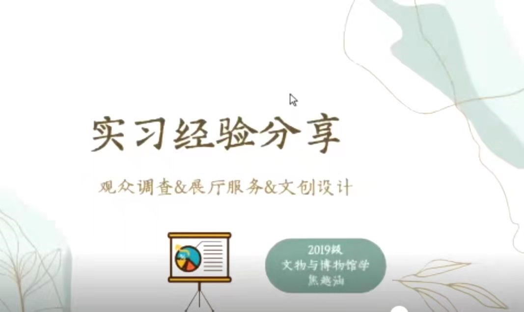 随后,来自19级的四位同学作了经验分享。郝雨卓同学就博物馆实习工作中的新媒体宣传工作和社教活动与实习感悟进行分享。梁开来同学从策展角度出发,以自己参与的通草画展览和吉林省历史陈列展的经历为主线传授经验,并为同学们带来了充实愉快的实习趣事。张灵江同学从藏品入库和策展角度为大家带来了如何从零开始完成工作的宝贵经验。焦越涵同学阐述了观众调查、展厅服务和文创设计三个方面的经验,并向同学们提出了建议。