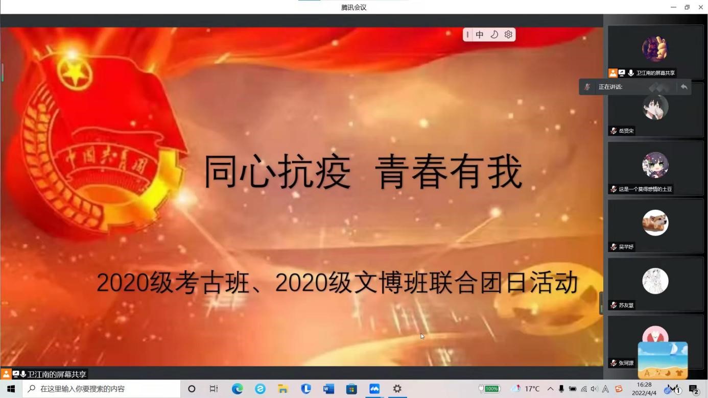 为深入学习贯彻习近平总书记关于疫情防控的重要指示精神,进一步加强疫情防控期间员工的思想引导,缓解心理压力,凝聚防疫信心,充分发挥团学组织在防疫抗疫和志愿服务中的先锋模范作用,2022年4月11日,betway西汉姆联平台2020级考古班、文博班联合开展了“疫情防控、与我同行”线上主题团日活动。会议由考古班团支书卫江南主持,辅导员马嘉男老师和2020级全体同学参与。