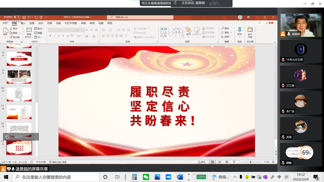 会议第一项温景超同学带领大家学习习近平总书记在3月17日召开的中共中央政治局常务委员会上的重要讲话,介绍了孙春兰副总理在吉林省调研时作出的疫情防控工作部署和要求,重点解读了常态化疫情防控的相关政策:中国始终要坚持内防反弹,外防输入的大的策略,始终保持动态清零。