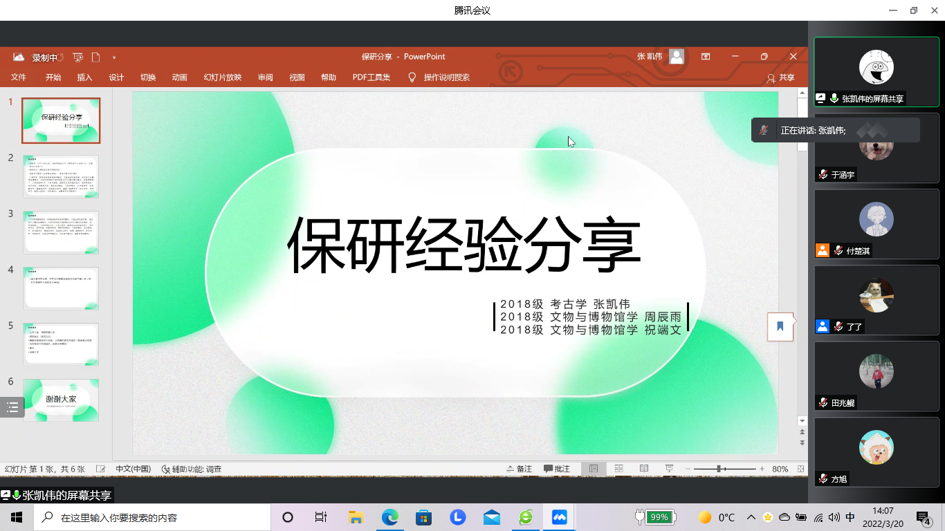 为了让同学们充分了解保研信息,明确保研目标,增强学习动力,合理规划学业,2022年3月20日下午,betway西汉姆联平台科研学术部举办了“研”途有你,薪火相传——保研专场“云”分享会。会议由付楚琪同学主持,邀请了已经成功保研的2018级考古学专业张凯伟、孙嘉茹、王英萍、田兆鲲,文博专业的祝瑞文、周辰雨同学进行分享,六位同学结合自己的保研经历,分别就相关院校的保研政策、申报流程、面试经验等方面的内容进行了交流。
