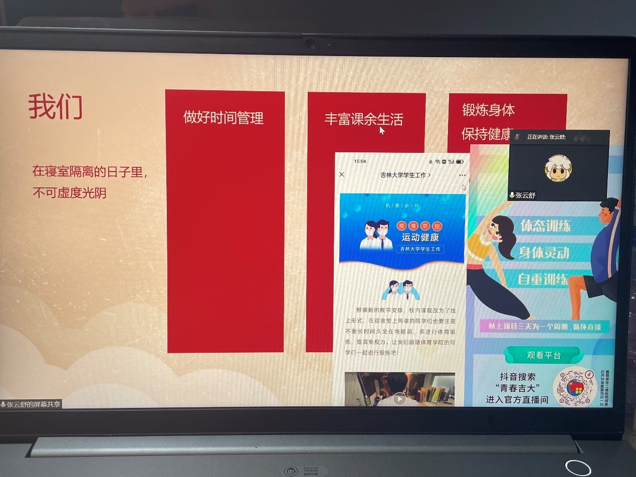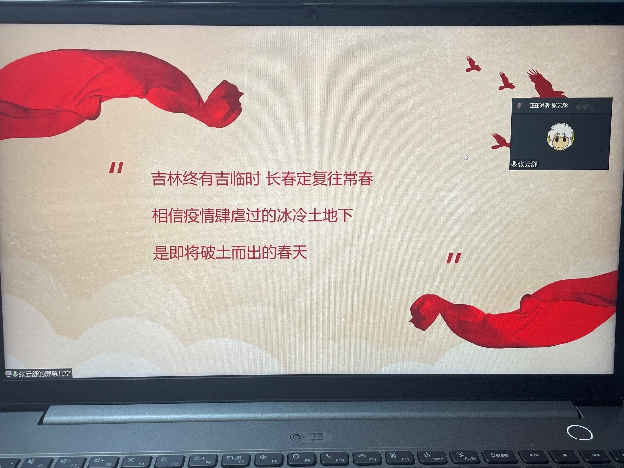 会议伊始,宣传委员张云舒同学作为主讲,梳理了学校和学院在此次疫情防控中所开展的一系列行动,并向同学们宣读了当前的疫情防控政策和要求。随后,全班同学进行了积极讨论,大家踊跃发言,表达了对疫情发生以来学校师生齐心协力、共同抗疫的所思所感。同学们认为,突如其来的疫情虽然打破了正常的学习和生活规划,但并没有对自己的生活带来很大困扰。恰恰相反,面对突入其来的疫情,自己无时无刻不感到学校和学院老师的关怀,同时也感受到了志愿者同学的鼓励和关照。大家不仅得到了学校提供的餐饮和防疫物资保障,而且逐渐适应了网络课堂教学模式,即使在隔离管控中,也并无紧张和忧虑。并且认为只要上下一心,团结互助,就能早日战胜疫情。