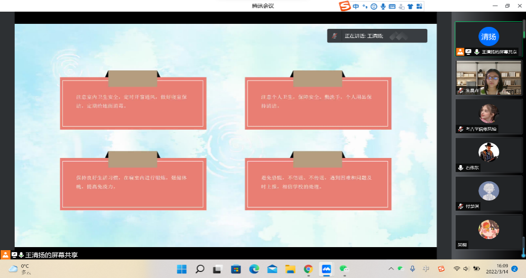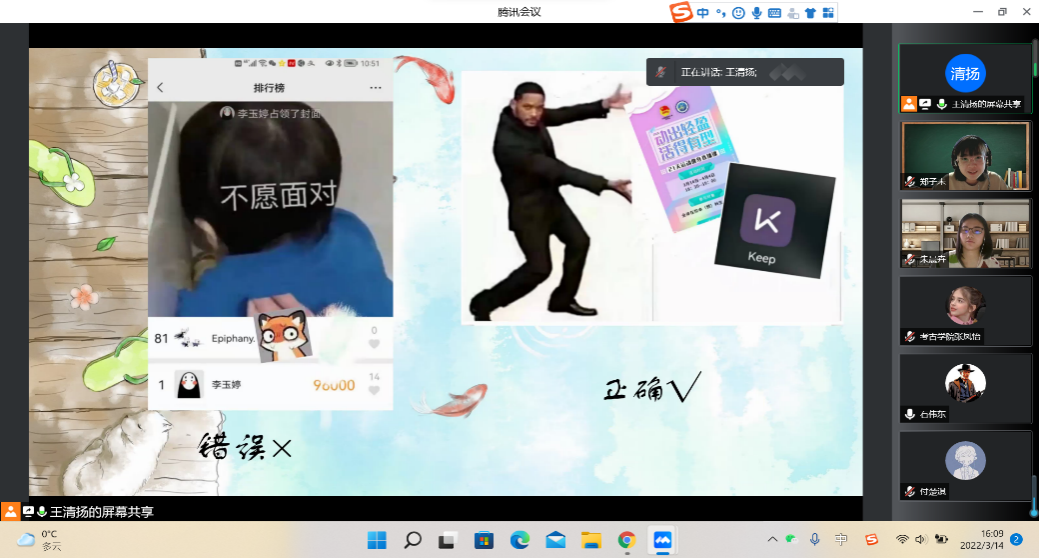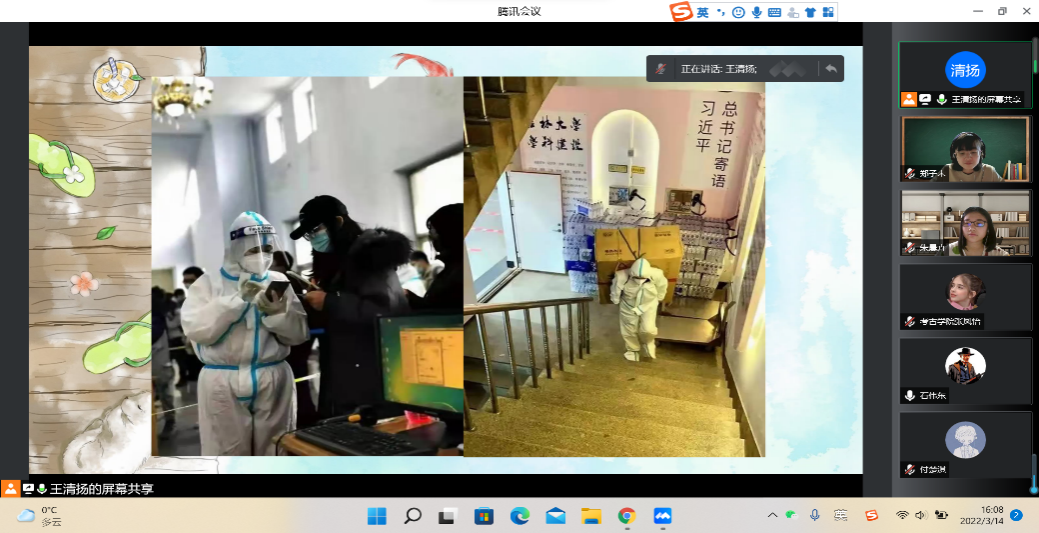 3月14日下午,按照学院防疫工作部署,2021级古文字班于线上组织开展了疫情防控导学主题班会。会议由班长王清扬同学主持。
