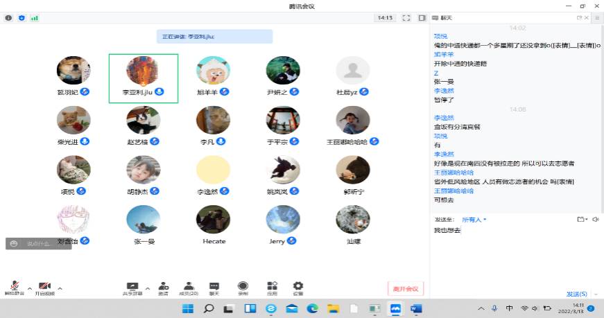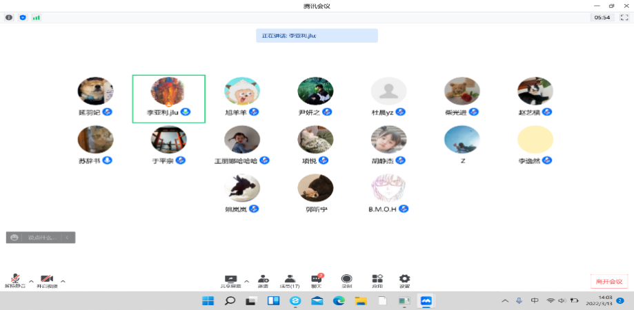 3月13日下午,2020级文博班召开了线上防疫导学主题班会。会议由班主任李亚利老师主持,班级全体同学参与了此次会议。会议伊始,李亚利老师首先针对校内的生活物资供应,同学们的日常饮食配送等方面的内容作了详细介绍。强调了个人隔离防护的注意点:宿舍走廊也要戴好口罩,口罩要勤更换;注意个人卫生,勤洗手;做好健康观察、核酸检测;同学间互帮互助,相互鼓励等。随后,李亚利老师又统计了全班的志愿者人数,鼓励大家在确保自身安全的情况下为学校防疫做出贡献,对同学们积极向上的心态给予了肯定。最后,李亚利老师向同学们提出了一些学习建议,对学年论文资料查找的一系列问题作出了指导,提醒大家即使线上网课,也要认真对待,不可松懈。