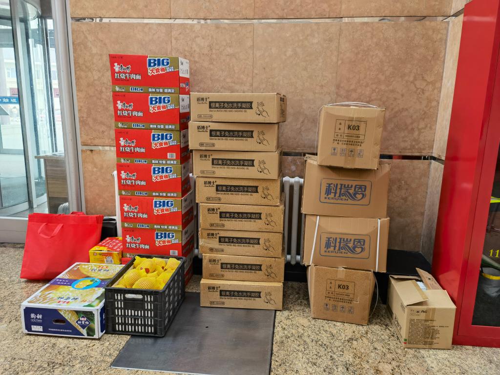 在物资发放前,各位老师分头前往超市进行集中采购,根据员工名额分别购买牛奶、饮用水、香肠、苹果、桶装泡面等食物,根据同学们的个性化需求购买湿巾、洗手液等日用品。十一时许,各位老师抵达大学城并将12个加油包整齐摆放至清洁区处,与公寓工作人员确认员工个人信息和寝室号码后,包裹由工作人员完成配送。当日中午,隔离员工纷纷发来反馈,表示已及时收到加油包,并对学院的关怀表示感谢。