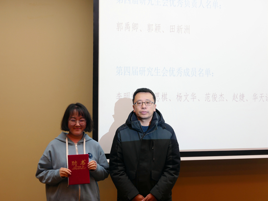 听取各部门工作报告之后,高铷婧同学宣布表彰优秀研究生会成员名单,侯建峰书记和于歌老师为受表彰同学颁发证书,以资鼓励。侯书记肯定了第四届研究生会于本学期所做的工作与努力,赞扬研究生会诸位同学在不耽误自身学业的情况下充分利用了自己的时间为学院、老师和员工办实事、做贡献。于歌老师祝贺研会在这一学期中所取得的成绩,肯定了研会所做工作,勉励大家继续努力,为学院、为老师和员工服务,在研会中锻炼自己,提高自己,做学院排头兵,学习、实践两手抓,做更加优秀的新时代青年。