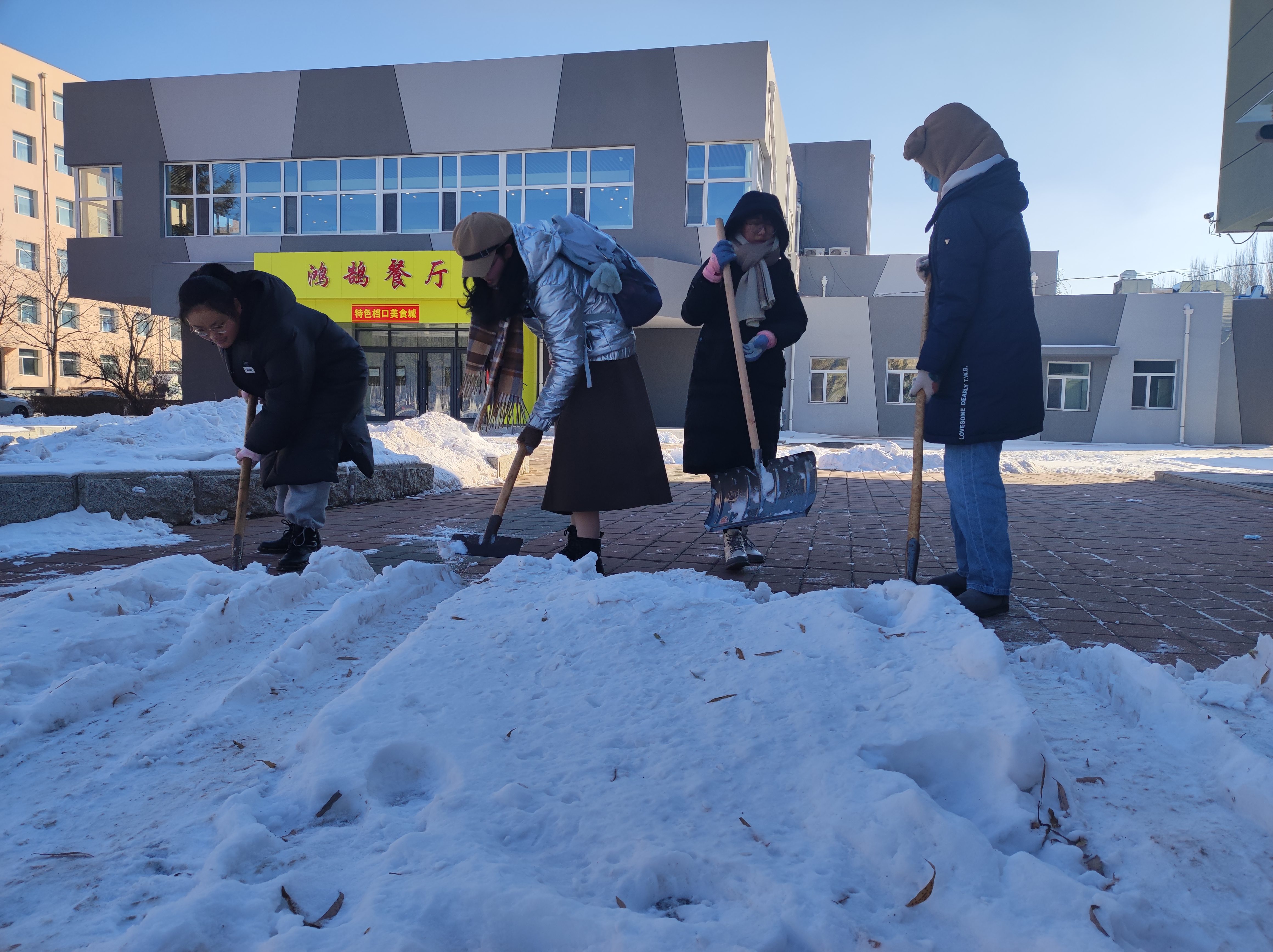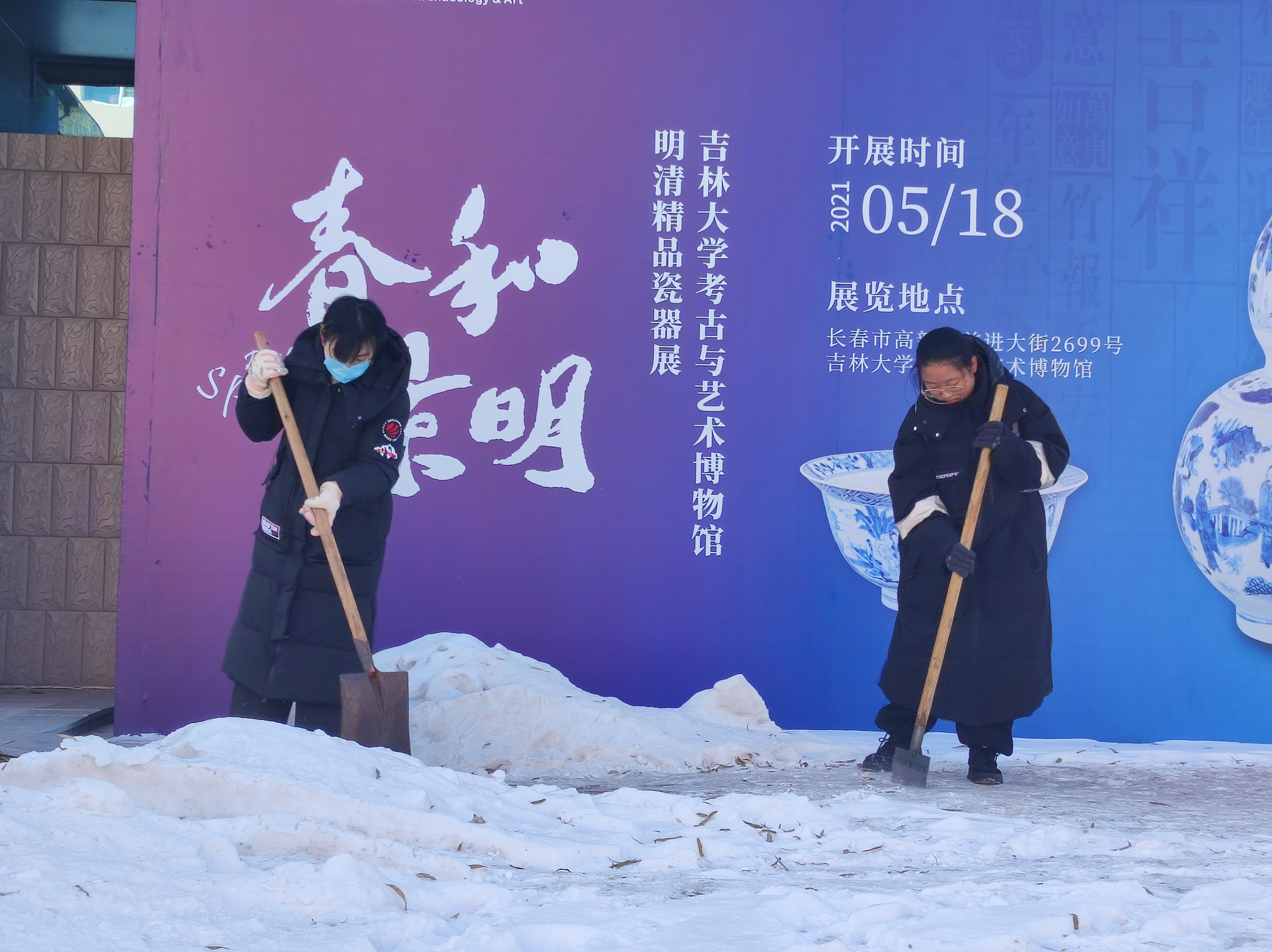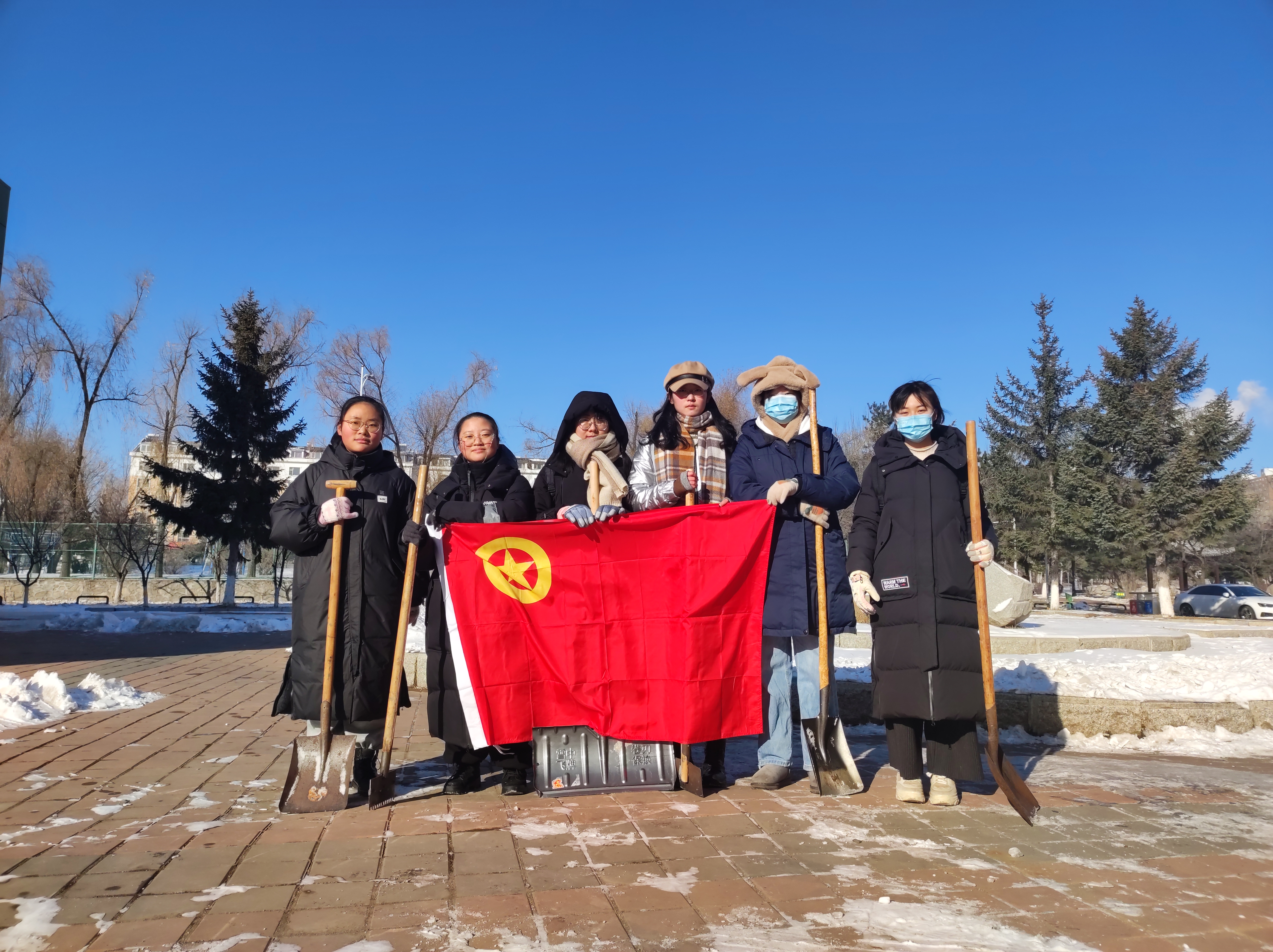 12点30分左右,田思昱、付楚淇、刘殷佚、杨柳和王清扬五位同学集合在考古与艺术博物馆前,在张馨予同学的带领下,大家不畏严寒,积极投身到扫雪除冰行动中。所有人都挥舞着铁锹和刀铲,有的铲、有的推、有的砸,齐心协力,分工明确,配合默契,干得热火朝天,忙碌的身影构成了一道靓丽的风景线。在劳动过程中,寒意逼人、人心却暖,大家劳动的热情和团结的力量显而易见,笑容洋溢在每位同学红彤彤的脸上。经过一个多小时的共同努力,原先的积雪冰冻被扫除,一条可供行走的安全道路被清理出来。
