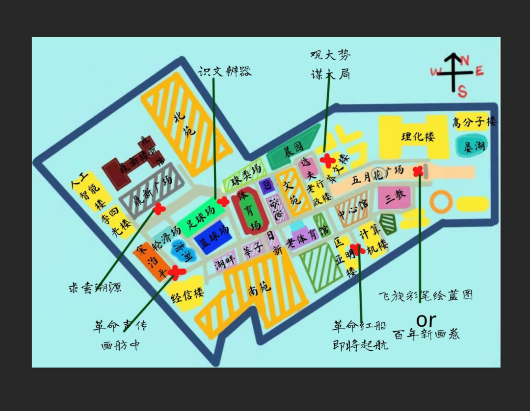 本次定向越野活动的主要形式为路线追踪,采取双人合作、奔跑角逐的分组对抗模式,巧妙结合趣味游戏和知识问答两种形式,引导同学们在越野闯关环节中深化对百年党史、考古与文物知识的认识和了解。活动以中心体育馆为起点,以考古与艺术博物馆为终点,分设东线与西线两条定向越野路线,并在足球场、鼎新广场、宋治平体育馆、匡亚明楼、萃文楼、五月花广场6处地点设立打卡处,活动范围覆盖整个中心校区。各参赛团体在起点随机抽取越野路线后,按照路线图指示,自由选择经过设定路线的4个比赛关卡,并在完成各关卡所设题目后前往终点完成比赛。现场工作人员记录各组比赛用时,对参赛小组的打卡本盖章验证,最终依据总时长评选获奖名单。