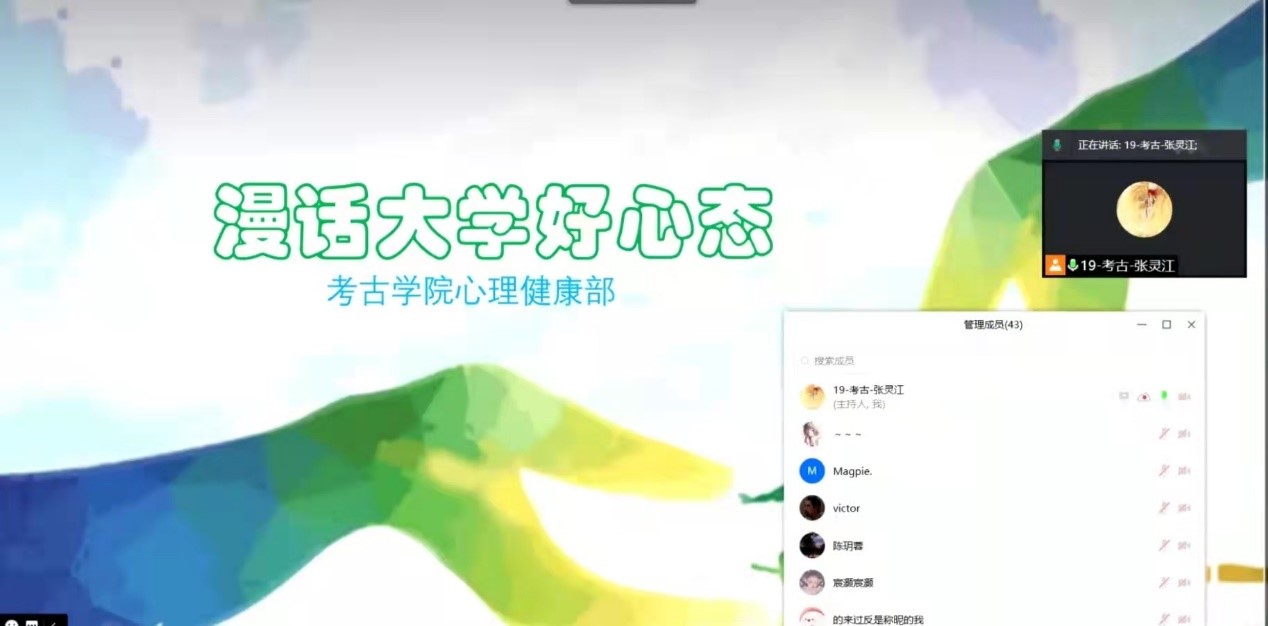 2021年9月17日下午,betway西汉姆联平台心理健康部面向2021级新生开展了“漫话大学好心态”主题云活动。本次活动的主要目的在于向广大新生宣传心理健康知识,引导和帮助新生做好学业规划,培养新生树立起自信自立、乐观向上、奋发有为的精神品格,为即将开启的大学新生活做好心理准备。活动邀请了18级考古专业田玉峰、19级考古专业温景超、19级文博专业赖琳、20级考古专业薛雯心和汤颖欣共五位发言人,分别就大学期间的学习感悟与良好心态养成等问题进行了经验分享。2021级部分新生同学参加了此次线上交流会。