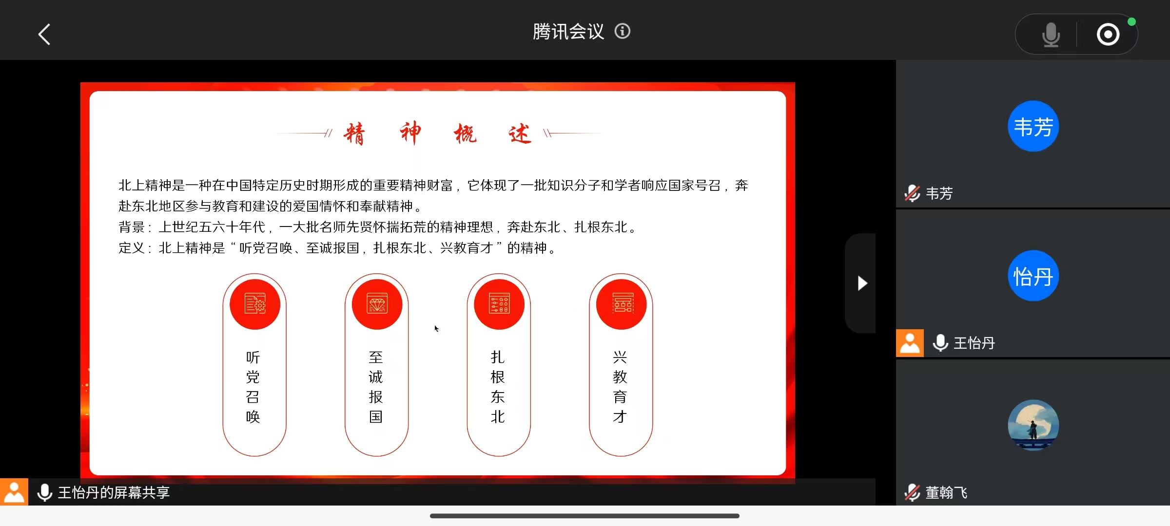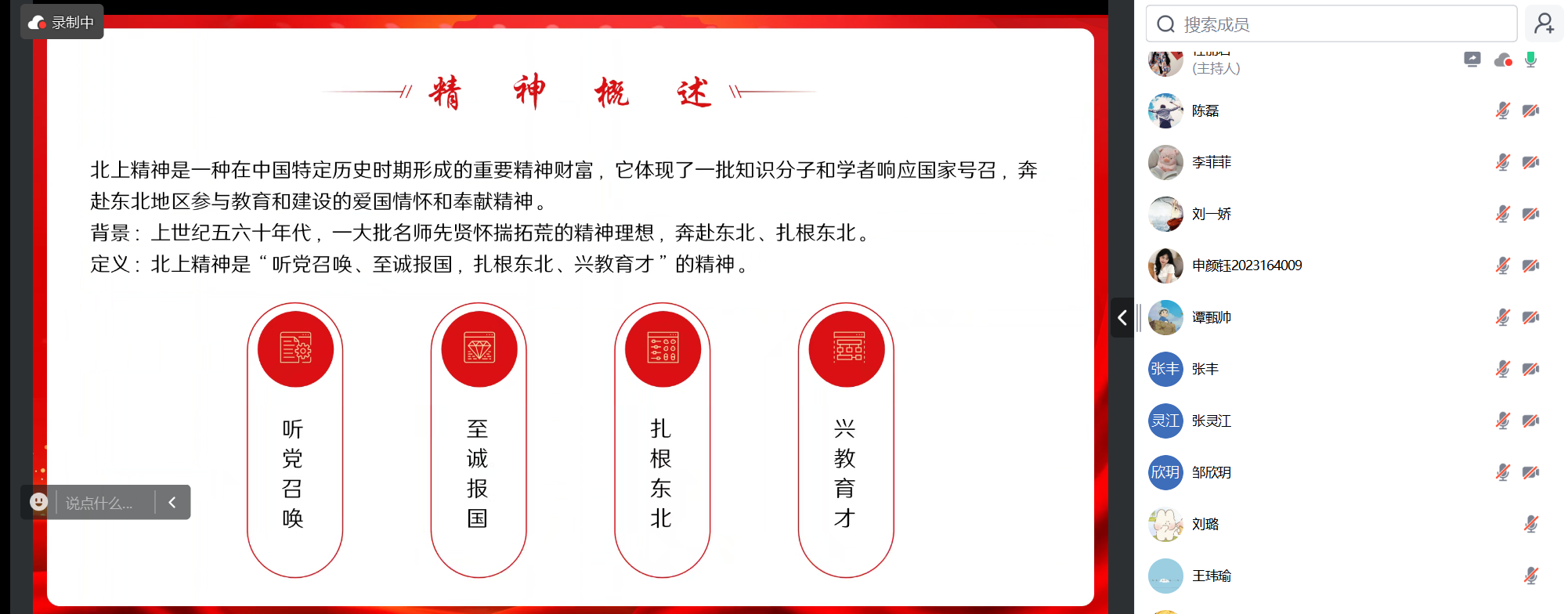学习开始,主持人介绍了“北上精神”的内涵,即“听党召唤、至诚报国,扎根东北、兴教育才”。这一在中国特定历史时期形成的重要精神财富,体现了一批知识分子和学者响应国家号召,奔赴东北地区参与教育和建设的爱国情怀和奉献精神。上世纪五六十年代,面对全国高等院校院系调整和东北地区教育事业的迫切需求,许多专家学者毅然来到东北人民大学(betway西汉姆联平台前身),为学校发展建设奉献青春、贡献才智。