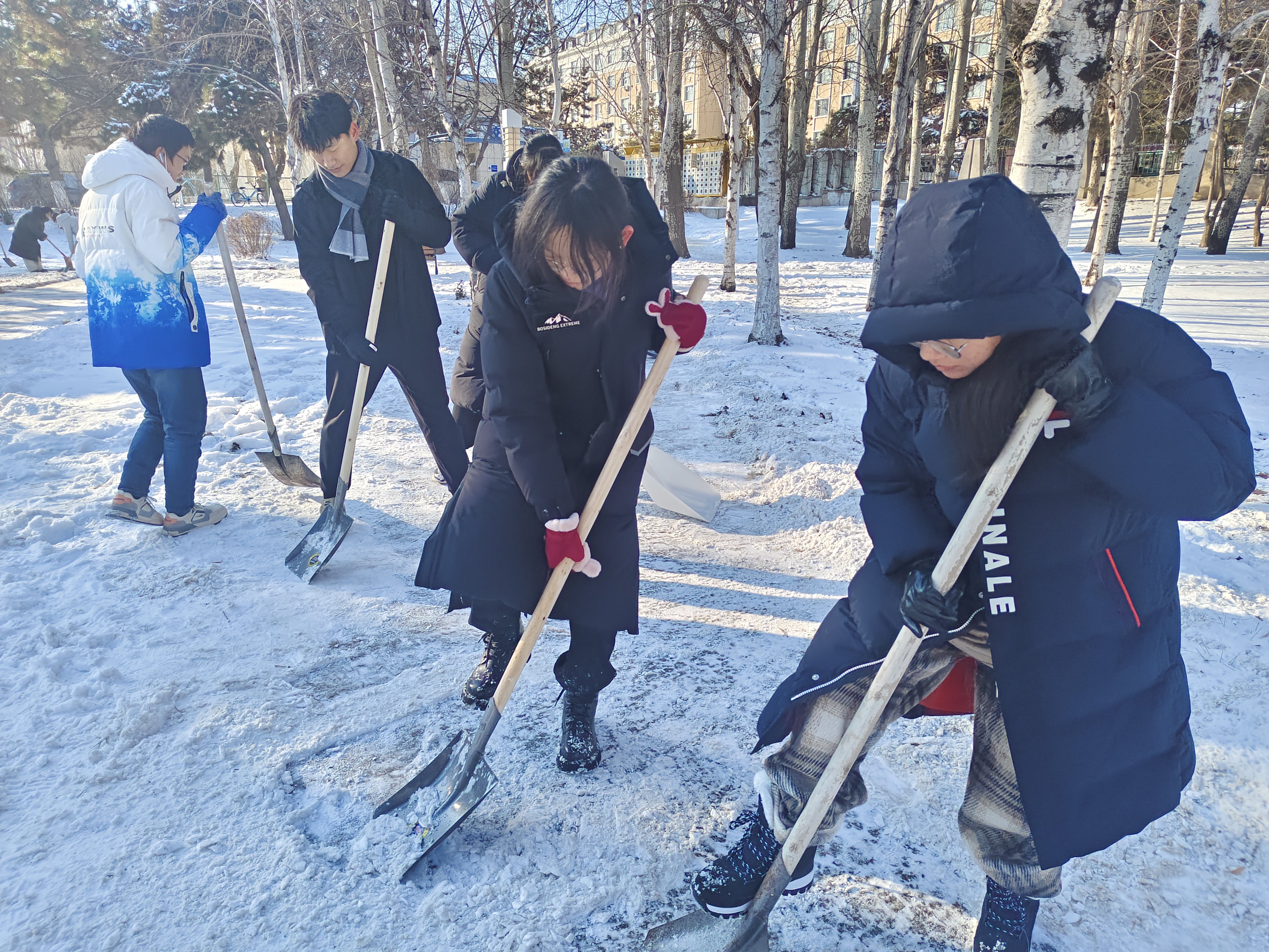 同学们不畏严寒,取用铁锹、雪铲等工具清除积雪、铲冰除冰,大家分工合理,配合默契,互帮互助,采用分区清理的方式,大大提升了扫雪除冰的效率。